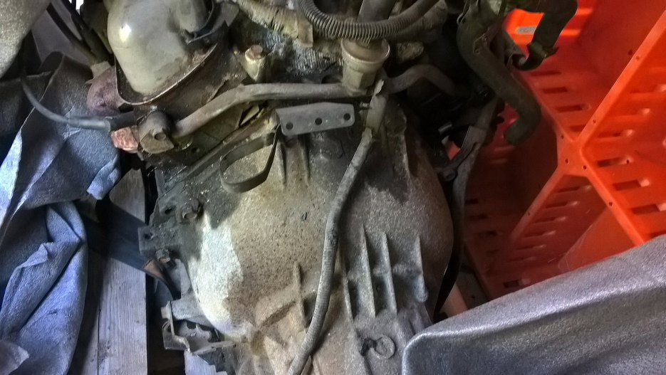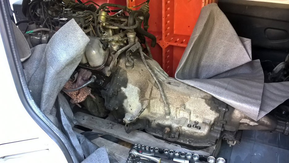 No to zacznijmy od odkręcenia i zdjęcia skrzyni. W busiku nieco ciasno, aięc tylko jedno zdjęcie, ale po zdjęciu rozrusznika i odkręceniu konwertera od koła zamachowego odkręciłem skrzynię od silnika.