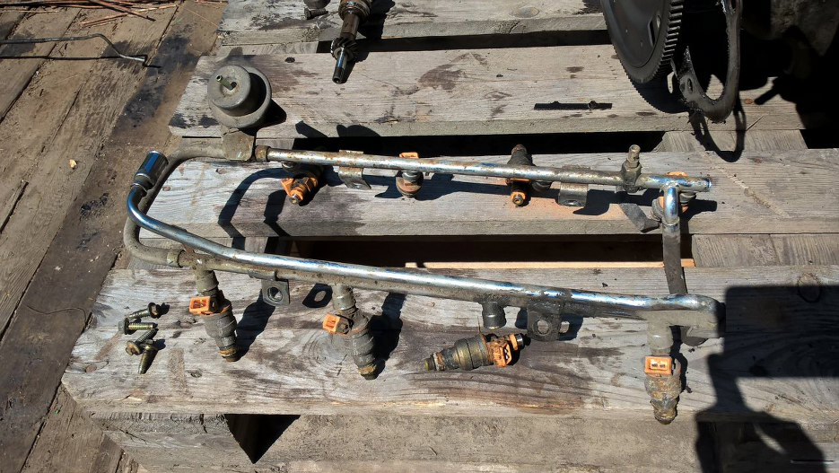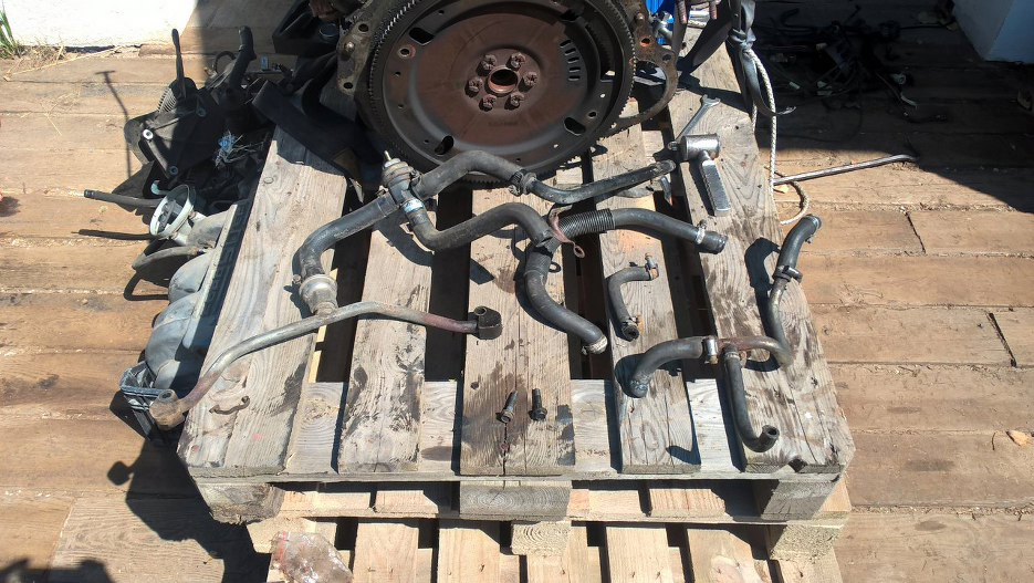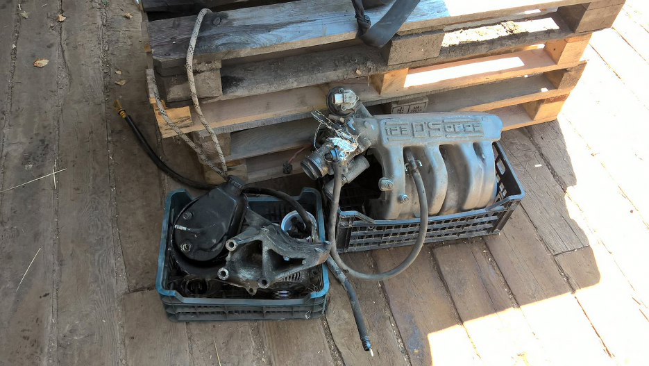 Potem ułożyłem palety na wysokość podłogi przestrzeni ładunkowej i mogliśmy wysunąć silnik. Skrzynię wyjęliśmy ręcznie. Do silnika jest kilka drobiazgów luzem. Zwłaszcza ten obrzydliwy, wtryskowy airbox.