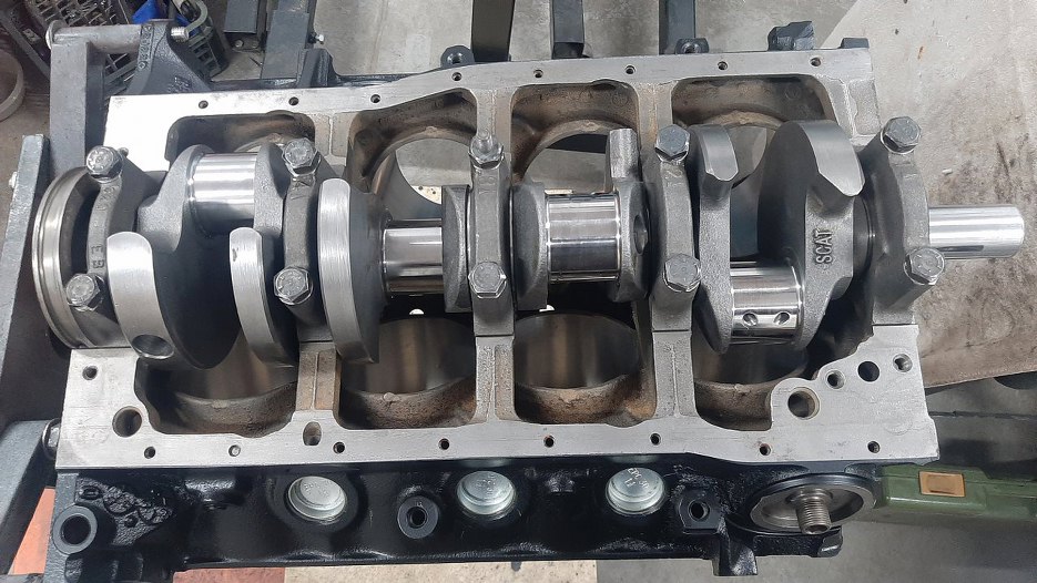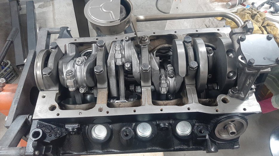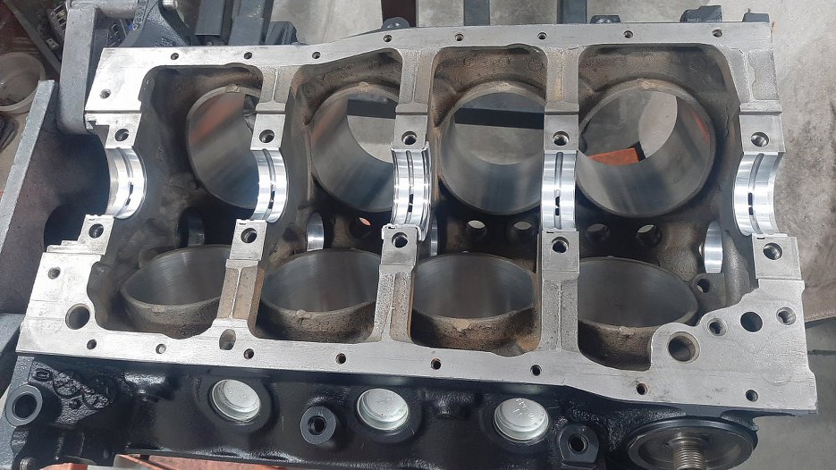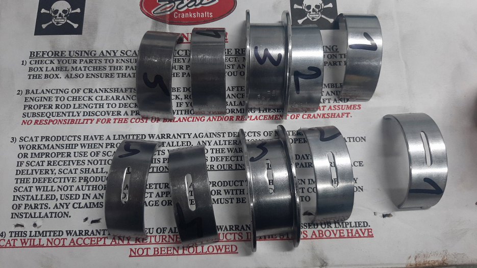 Dolne połówki nie maja otworów ani rowków. Widać też, że gotowy do włożenia jest wał korbowy. Przypomnę - wał korbowy, razem z tłokami i korbami jest nowy. Wszystko jest kute, wał ma większy skok, tłoki nieco większą średnicę. Pojemność silnika była 302 cale sześcienne (niespełna 5l), teraz będzie 331 cu in (5.4l).