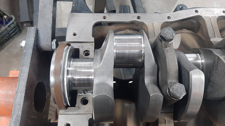 Delikatnie włożyłem wał na miejsce. Pierwsze cztery stopy wału już dokręcone, ostatnia trzyma też simmering tylny wału, który najłatwiej jest założyć właśnie teraz.