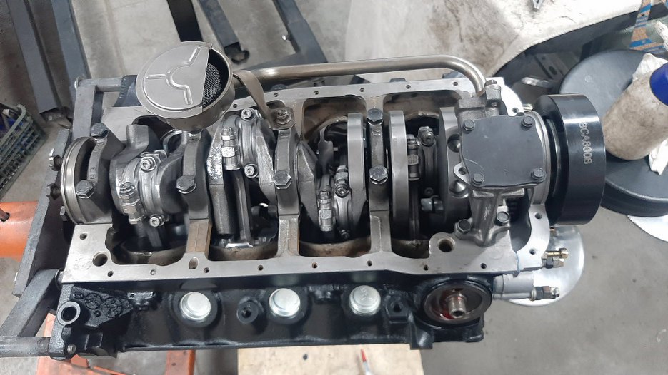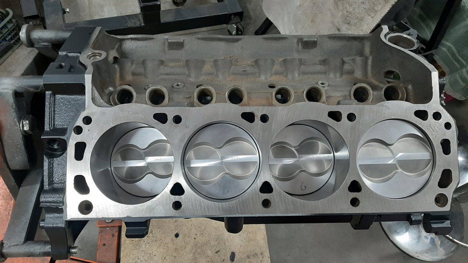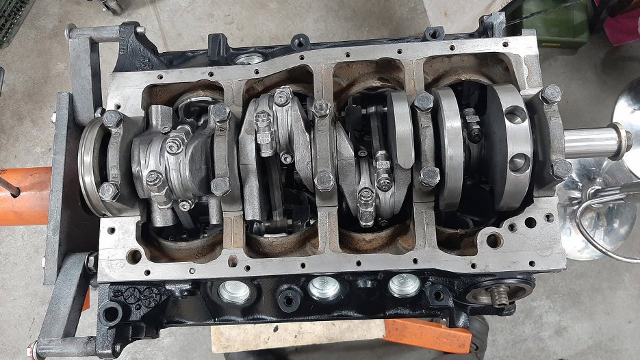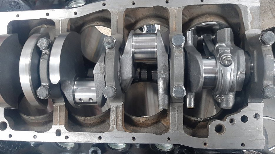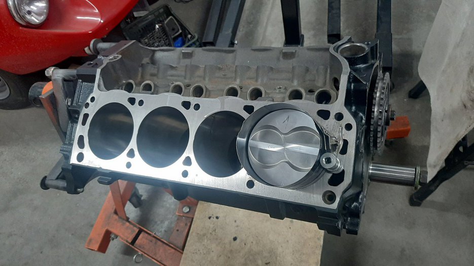 Układ korbowo-tłokowy złożony, obraca się bez problemu, chociaż, jak to w nowym, świeżym silniku, nieco ciasno. Ten zestaw wału korbowego o powiększonym skoku nie wymaga frezowania w bloku żadnych krawędzi, żeby zrobić miejsce. Są jeszcze stroker kity na pojemność 5.7l, tam już trzeba podszlifować krawędzie bloku przy misce olejowej i chyba też doły cylindrów, żeby zmieściły się śruby korbowodów.