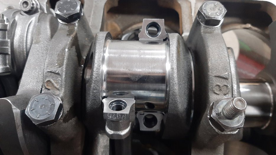 Zwróć uwagę na podfrezowania kątowe na korbowodzie. Między sąsiednimi korbami jest bardzo małe, między korbowodem a wałem korbowym - większe. Widać to najlepiej obok panewki - jest przesunięta w stronę sąsiedniego korbowodu.