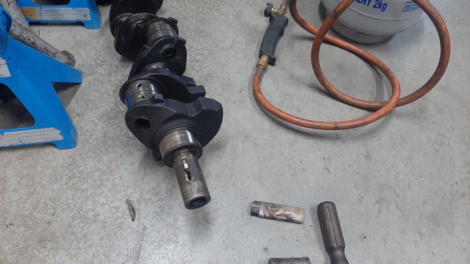 W nowym wale korbowym nie było klinu, musiałem go pozyskać ze starego wału. Był dość uparty, jak widać po użytych przyrządach wydobywczych.