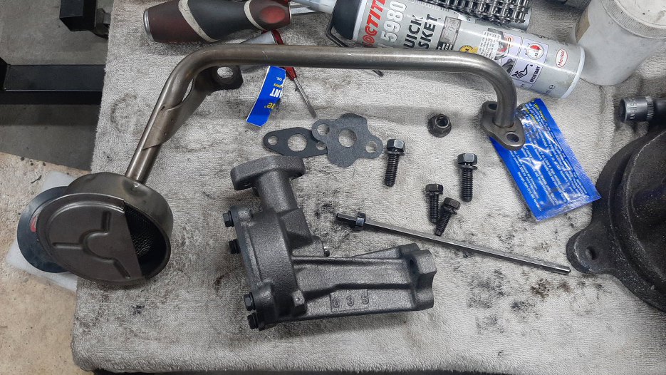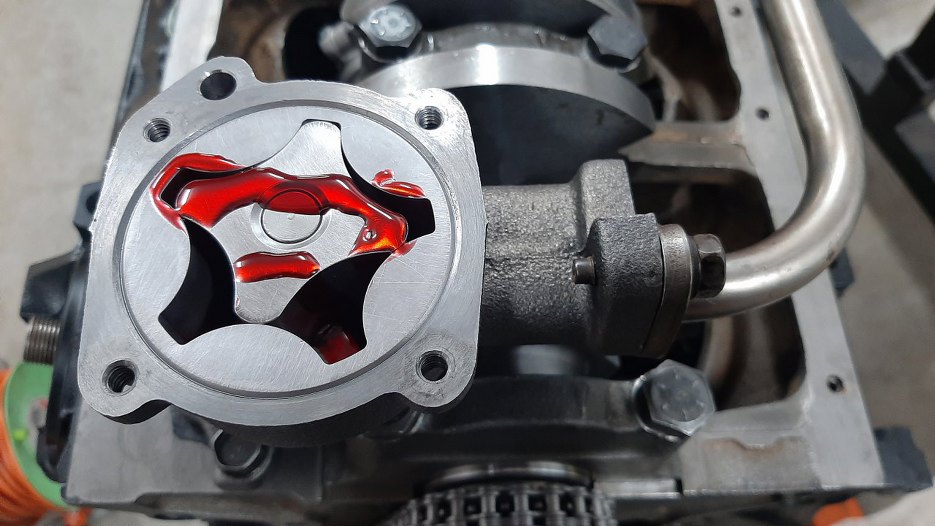 Zdjąłem pokrywkę pompy oleju i wlałem do niej trochę smaru montażowego. Dzięki temu będzie jej łatwiej zassać olej z miski.
