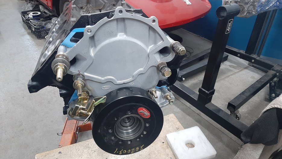 I oczywiście skląłem Forda. W Chevrolecie pokrywa rozrządu jest tylko pokrywą rozrządu, przykręca się ją na chyba 10 identycznych śrubek. A tu? Każda jest inna, sporo z nich trzyma też pompę wody, więc są dłuższe, i trzeba kombinować jak to przykręcić. Na razie zamiast pompy wody zrobilem profesjonalne dystanse z różnych nakrętek. Inna sprawa, że i w bloku i w pokrywie są podfrezowania na kołki ustalające je względem siebie, ale kołków w tym silniku nie było. Założyłem od razu tłumik drgań skrętnych wału. Wał jest zewnętrznie ważony, czyli oprócz przeciwwag w środku silnika są też na zewnątrz - na kole zamachowym i na tym tłumiku. Tyle, że tu tej przeciwwagi nie widać, bo jest od strony bloku.