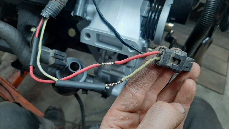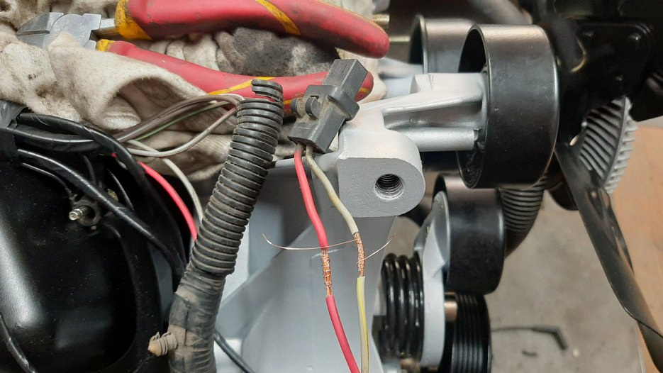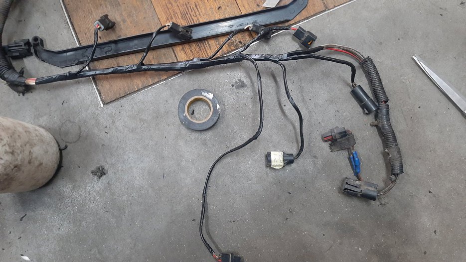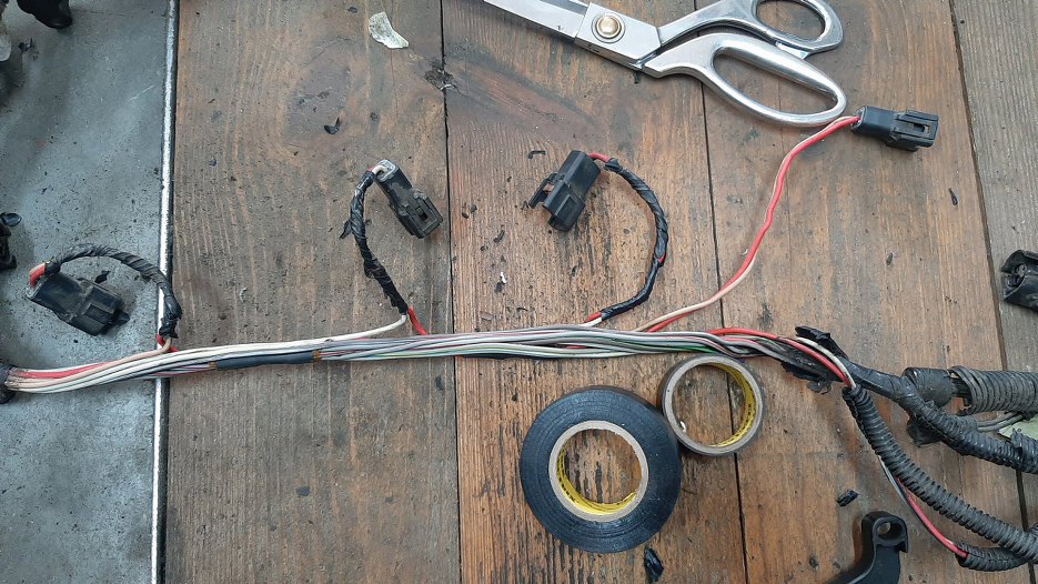 Zacząłem od końca wiązki, czyli od prawej przedniej strony silnika. Po kolei zdejmuję izolację, czyszczę kabelki, sprawdzam, czy wtyczki nie wyglądają podejrzanie, a następnie zawijam w nową izolację.