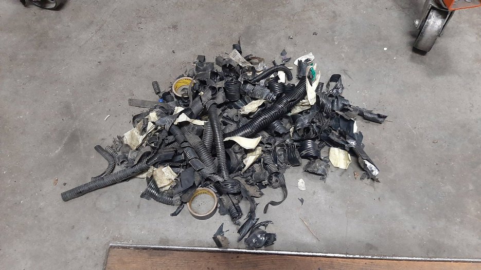 Następnie wyciągnąłem wiązkę silnika. Ogólnie przewody są w dobrym stanie, chociaż całość jest dość brudna, a izolacja i peszle pokruszone z temperatury i wieku.