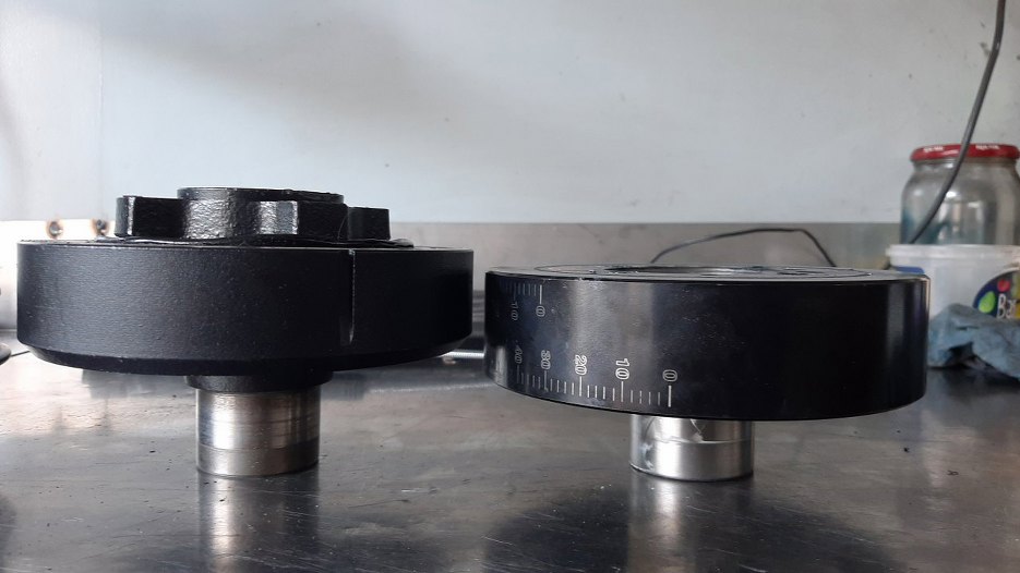Przedsięwziąłem wizytę u tokarza, z wcześniej przygotowanym rysunkiem technicznym. Rezultat jest widoczny na zdjęciu - wytoczony został z aluminium dystans odpowiedniej grubości. O tyle fajnie wymyśliłem, jeśli mogę się pochwalić, a tokarz wykonał, że dystans ma podtoczenia centrujące go z jednej strony w balanserze, a z drugiej strony w kole pasowym.