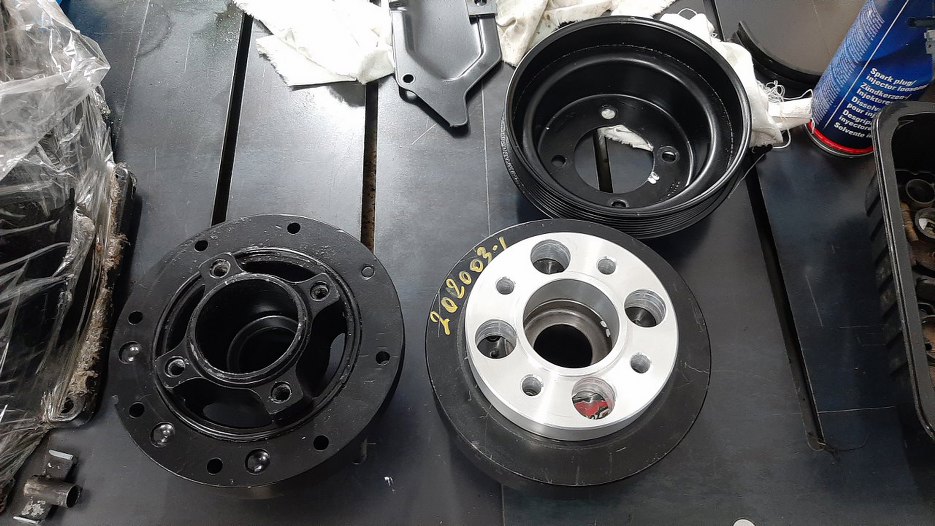 Następnym wyzwaniem okazało się kółko pasowe wału korbowego. Stary balanser jest po lewej, nowy po prawej. Jak widać, jest krótszy o prawie cal. Przykręcenie do niego koła pasowego jest oczywiście możliwe, ale paska już na to bym nie założył. Coś trzeba przedsięwziąć :).