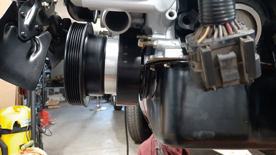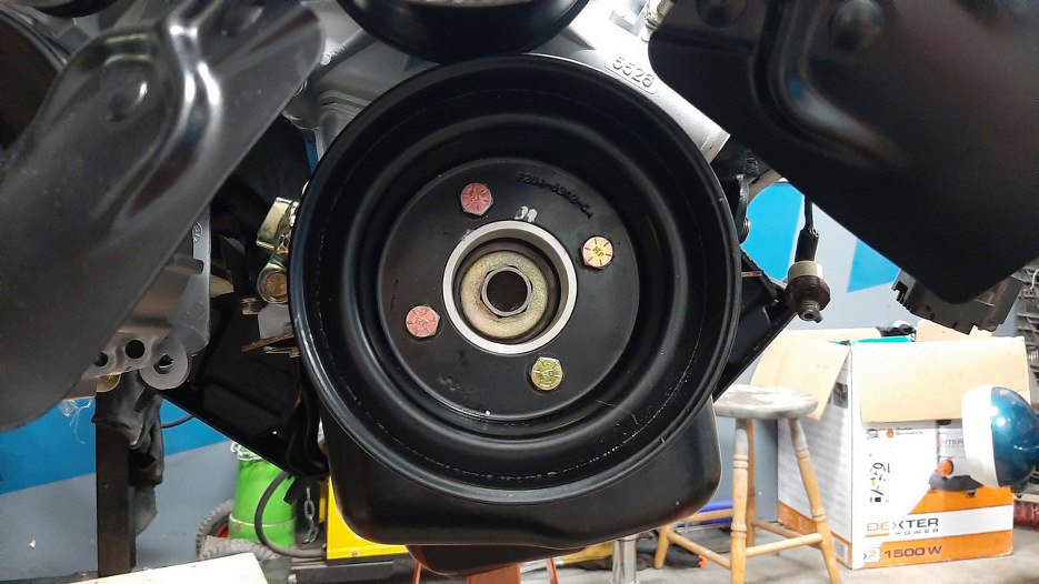 I przykręciłem koło pasowe poprzez dorobiony dystans.