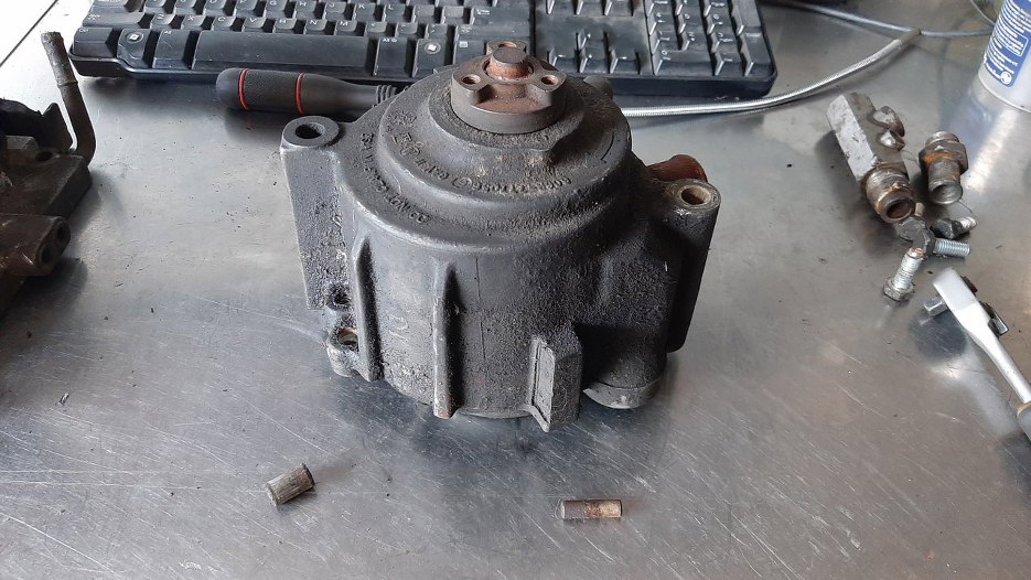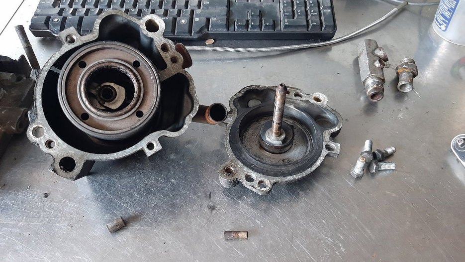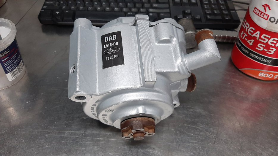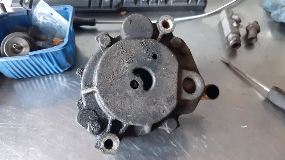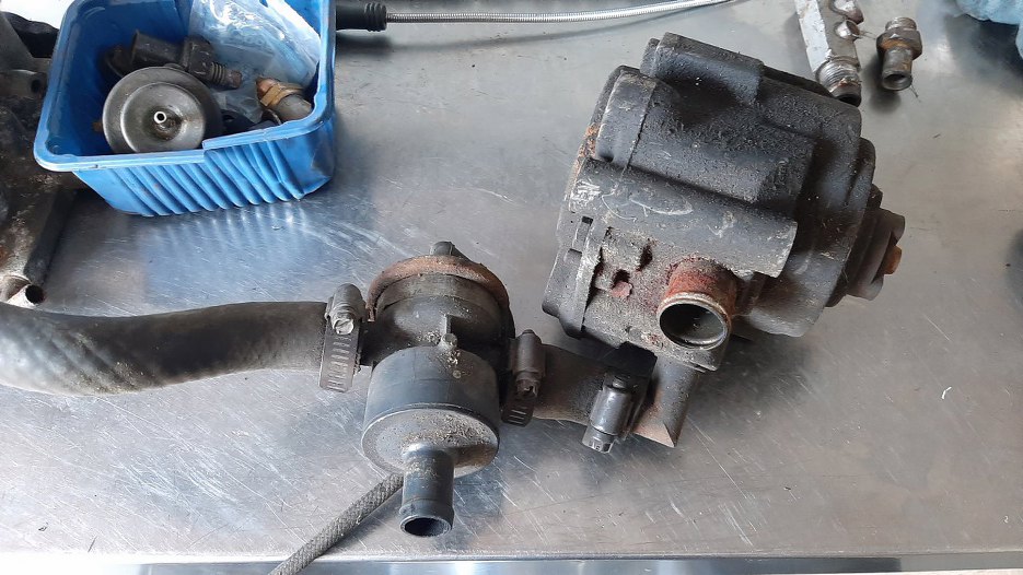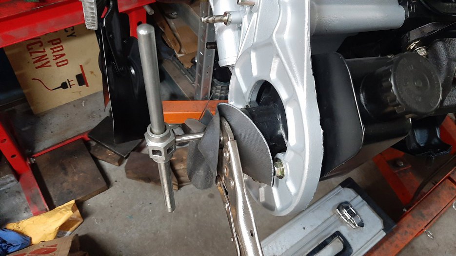 Zanim tokarz wytoczył mi dystans, zająłem się też założeniem koła pasowego na pompę wspomagania. Trzeba je wcisnąć na prasie, ale ciężko cały silnik włożyć pod prasę, więc musiałem poradzić sobie inaczej. Oś pompy ma w środku gwint. Niestety był dość zapyziały i żadna śruba tam nie pasowała. Po rozkminieniu jaki tu ma być gwint znalazłem w szufladzie odpowiedni gwintownik i zacząłem gwintować. Oczywiście musiałem jakoś przytrzymać ośkę pompy, więc wymyśliłem takie coś - szczypce morsa zabezpieczone gumą.