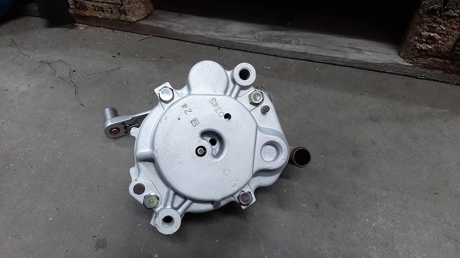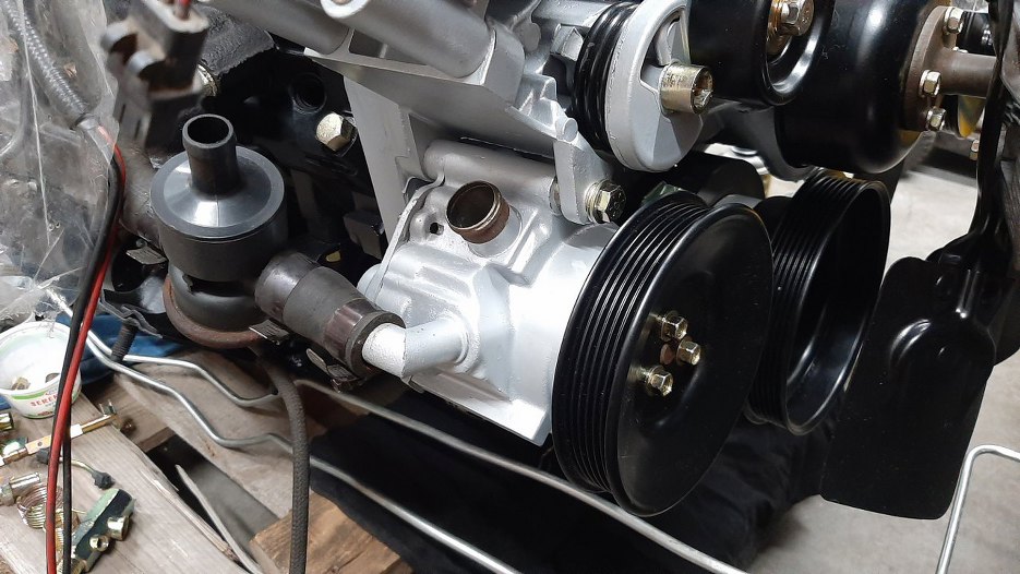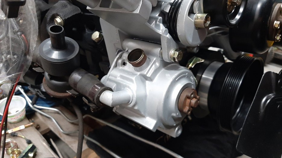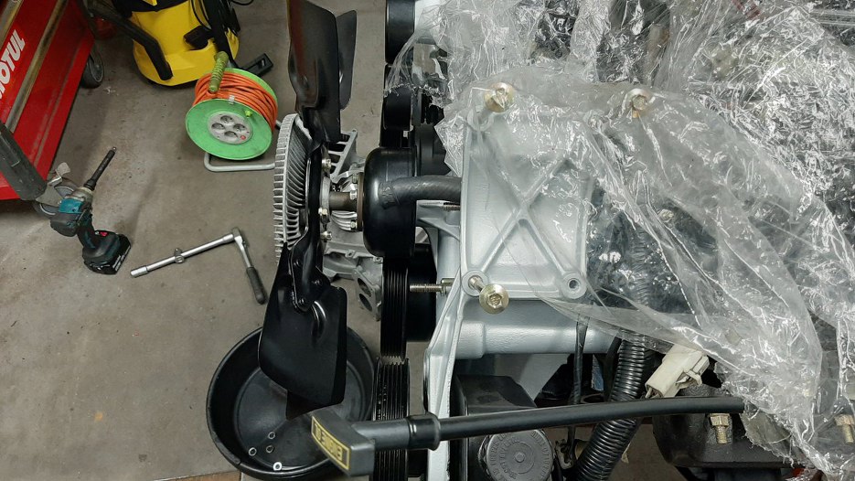 Potem mogłem wkręcić tam śrubę i dokręcając nakrętkę wcisnąć koło pasowe na oś pompy. Tu może będzie widać, że pas wielorowkowy powinien już się dobrze ułożyć na wszystkich kółkach pasowych.