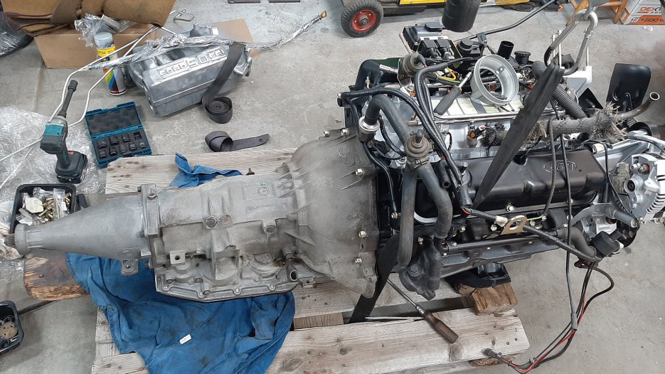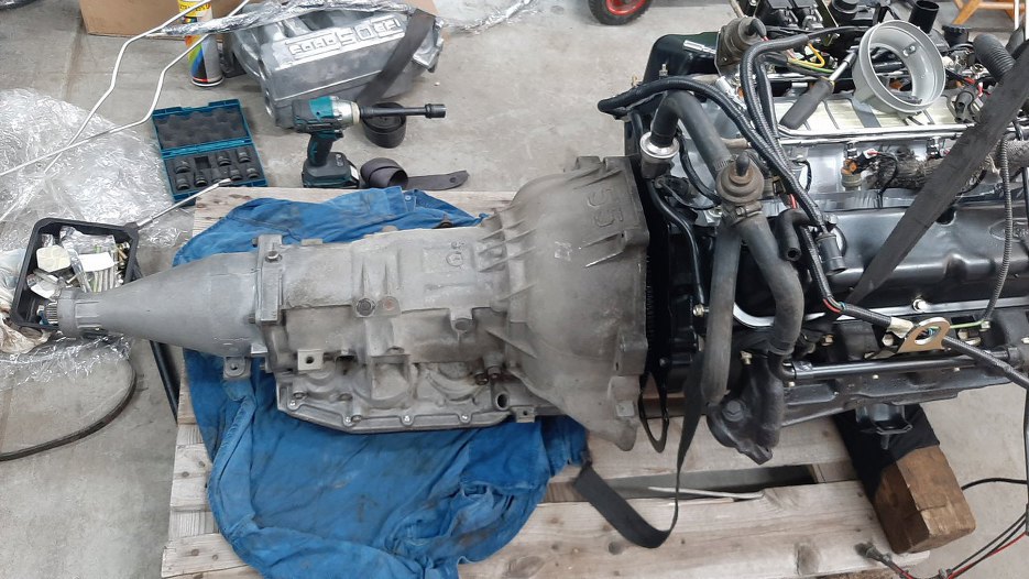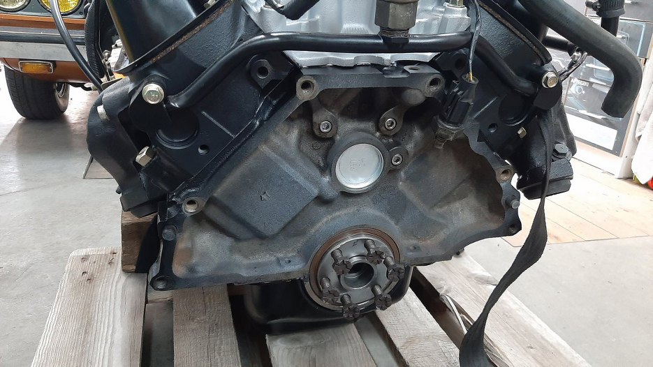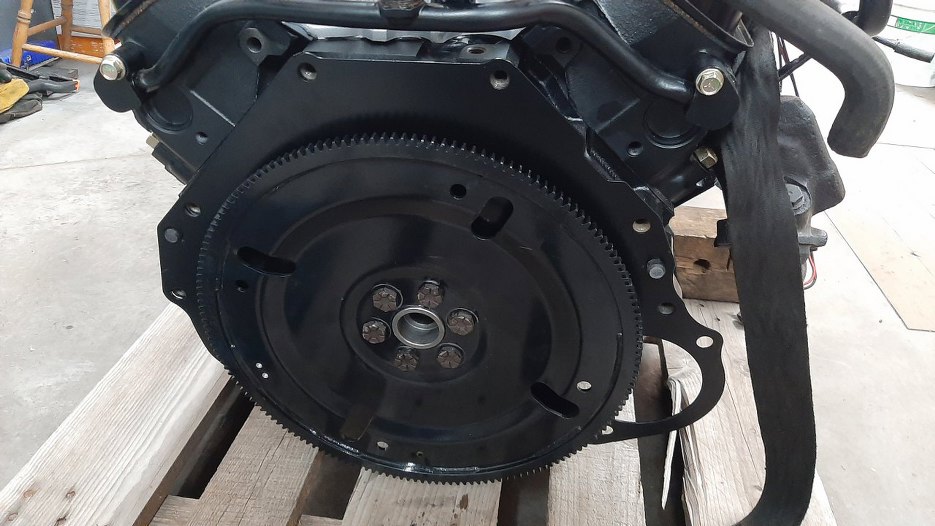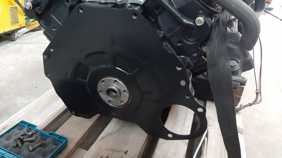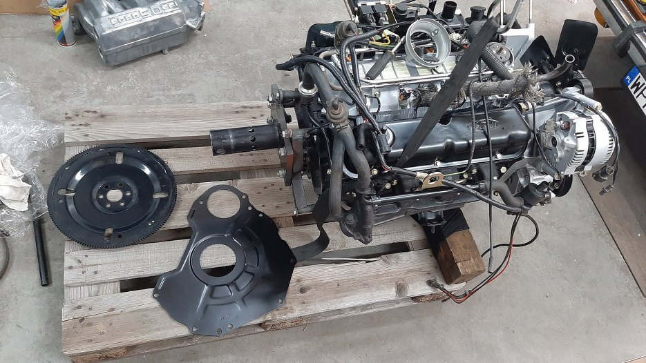 Na tym etapie w zasadzie już skończyły mi się możliwości składania silnika na stojaku i musiałem go zdjąć. Postawiłem go na palecie, na której prawdopodobnie wyjedzie z garażu. Przygotowałem blachę między skrzynię i silnik oraz koło zamachowe.