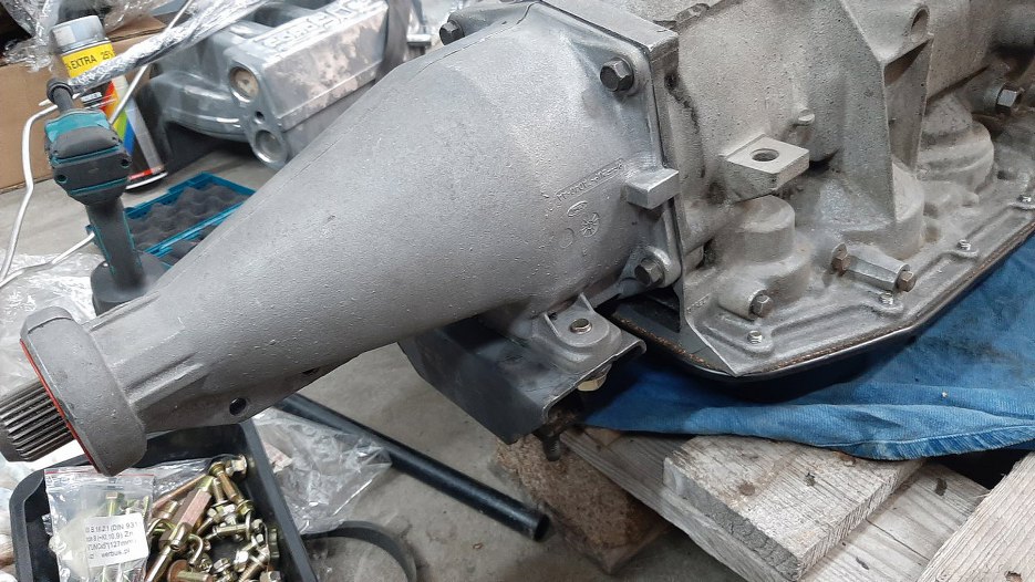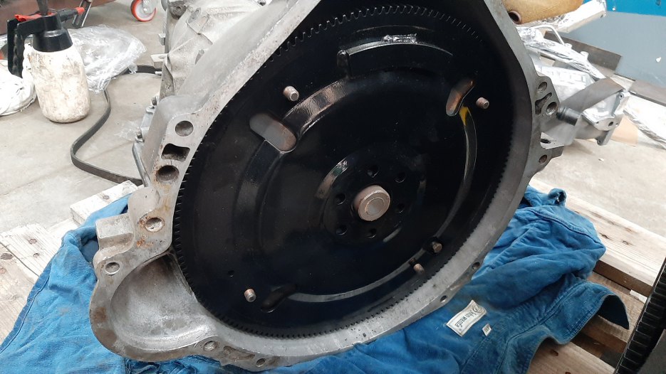Przysunąłem skrzynię do silnika i ustawiłem konwerter tak, żeby szpilki mocujące trafiały w odpowiednie miejsca w kole przy silniku.