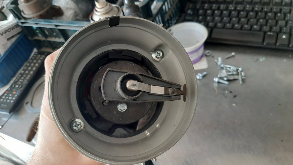 Tego plastiku trzymającego kopułkę nie da się źle założyć, bo ma niesymetrycznie śruby mocujące. Założyłem też palec rozdzielacza.