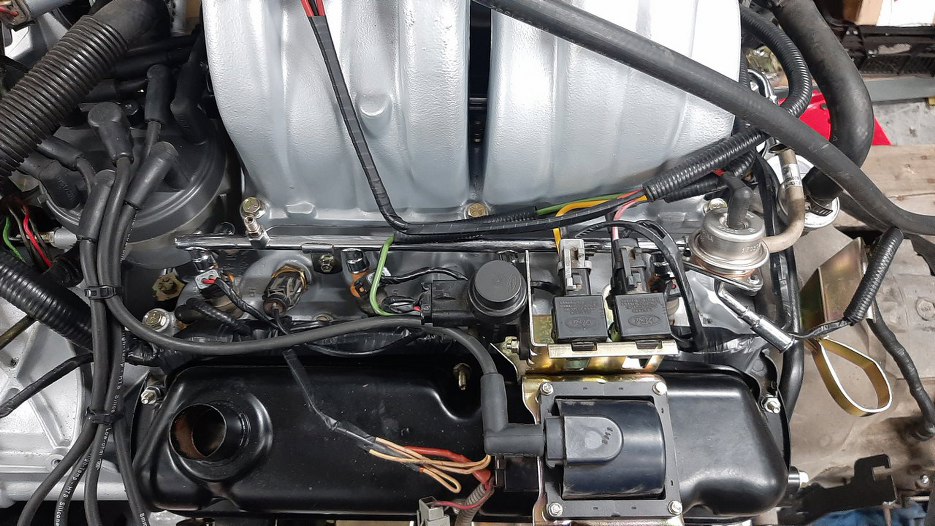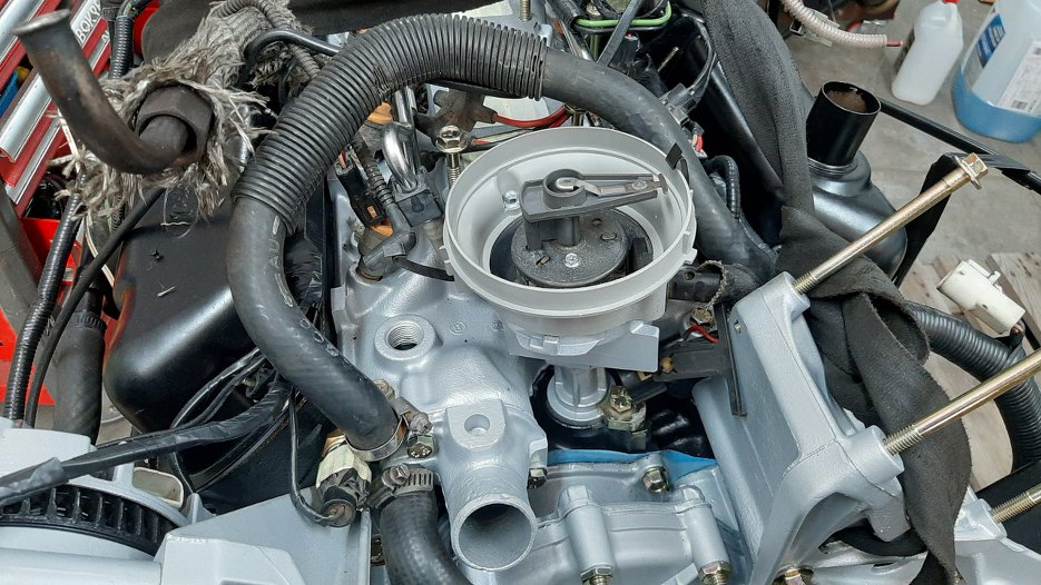 Następnie założyłem przepustnicę na miejsce. Strasznie wygląda ta plątanina kabelków. Dlatego nie lubię EFI :). Widać też, że założyłem kopułkę aparatu zapłonowego i kable zapłonowe.