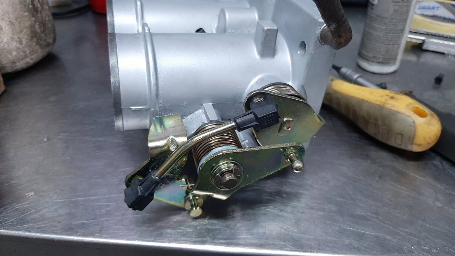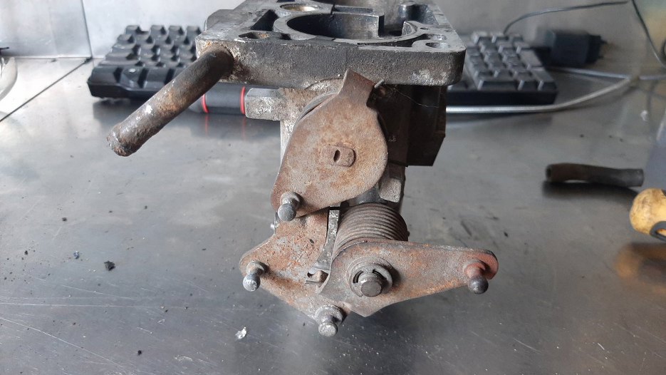 Dość skomplikowany mechanizm przenoszący ruch z linki gazu na otwarcie przepustnicy.