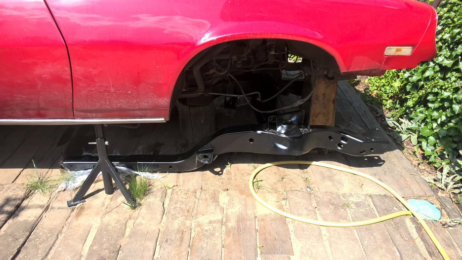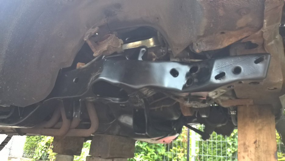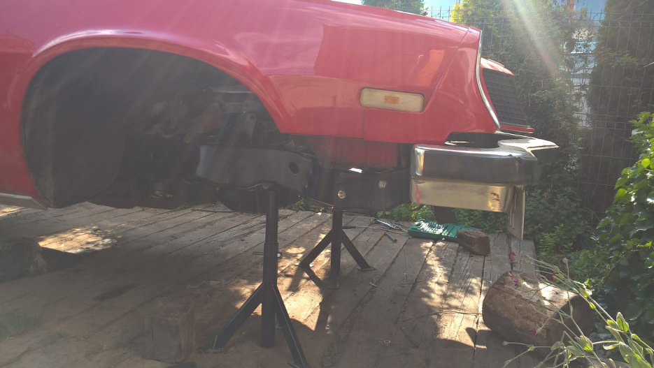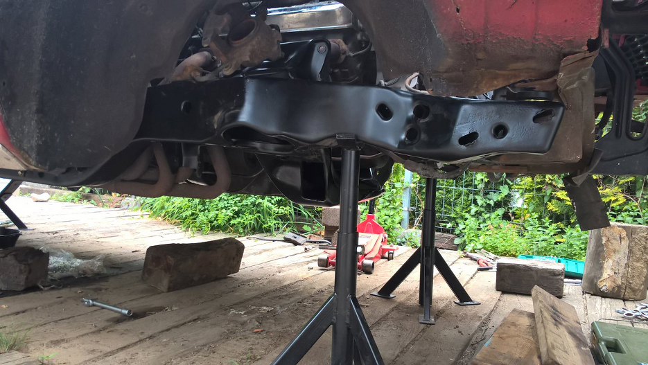 Teraz można już było oprzeć ciężar przodu auta na ramie. Kobyłki przestawiliśmy spod karoserii pod ramę, usunięte zostały podpórki spod chodnicy, skrzyni i silnika.