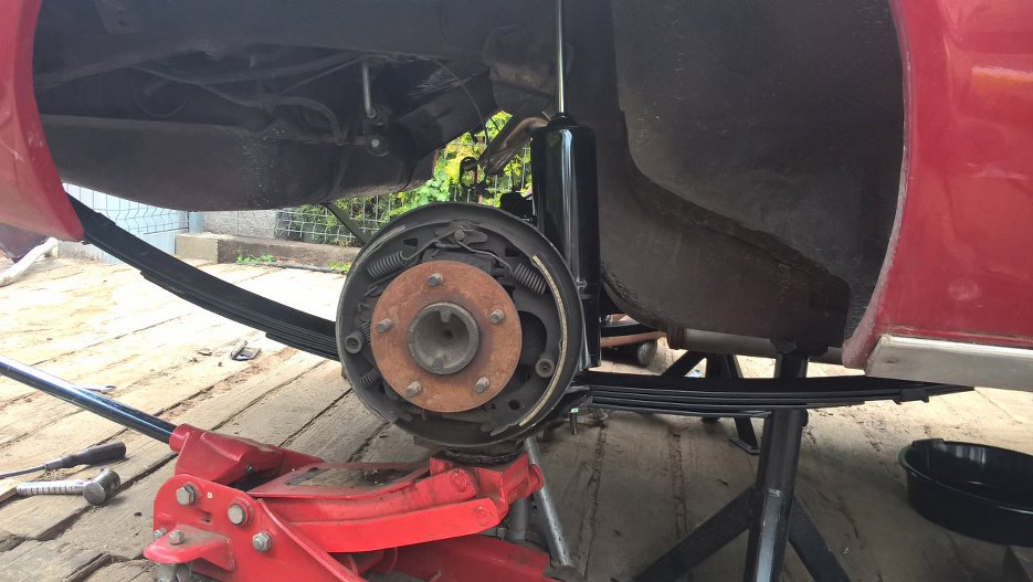 Następnie przykręciliśmy resor do mostu i zaczepiliśmy go do tylnych wieszaków, wszystko to z obu stron samochodu. Przykręciliśmy też amortyzatory, tym razem są właściwe i nie trzeba kątowników do ich mocowania :).