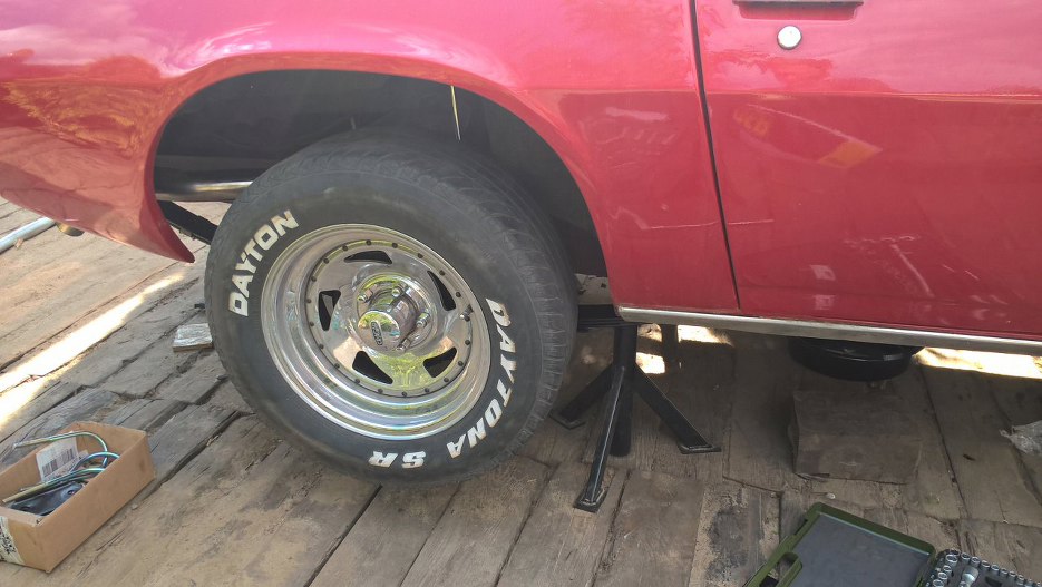 Dzięki temu tył auta stanął już na własnych kołach. Przód zostawiam jeszcze wysoko, żeby było łatwiej składać zawieszenie.