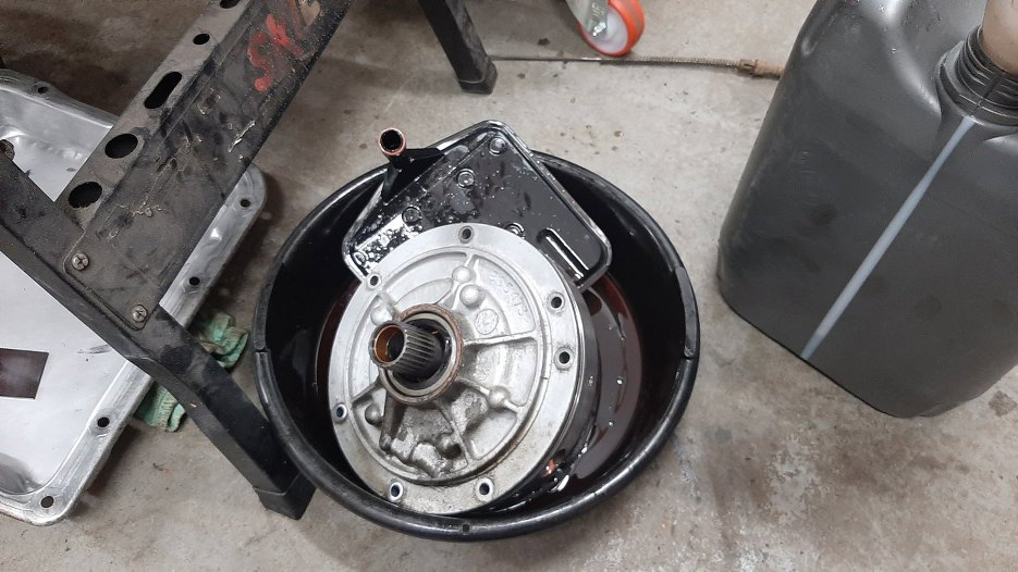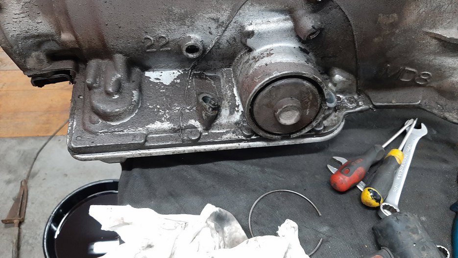 Następny temat do ogarnięcia to wyciek ze skrzyni biegów. Wymieniłem już tu kiedyś simmering tylny i o-ring bagnetu, ale wciąż problem pozostał. Do tego stopnia jest to poważne, że po nocnym postoju samochód zostawiał na ziemi (a właściwie w misce, którą podstawiał Mateusz) tyle oleju, że nie był w stanie ruszyć z miejsca.