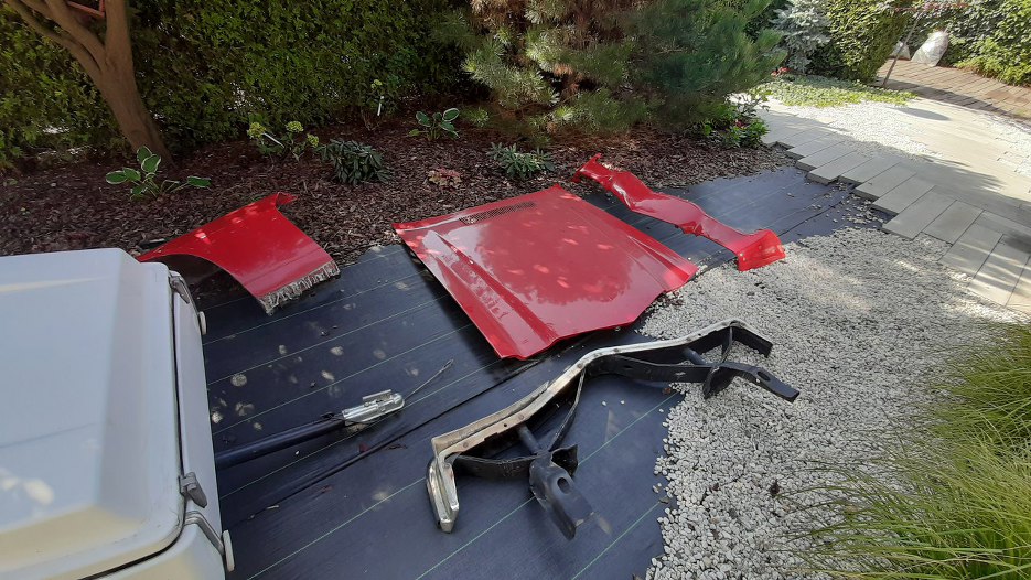 Dość szybko strona kierowcy była gotowa. Odkręcone było (w kolejności): maska, blotnik wewnętrzny, pas dolny, zderzak, wnęka lampy, błotnik zewnętrzny.