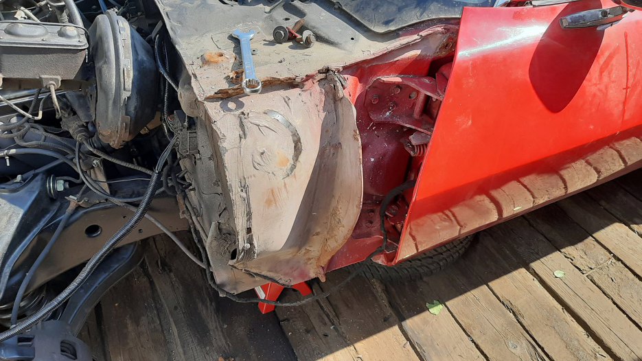 W międzyczasie przypomniałem sobie z czasu, kiedy odkręcałem półramę, że cały przód wisi na dwóch śrubach, po bokach chłodnicy, z czego gniazdo jednej jest wyrdzewiałe. A skoro już tyle części mieliśmy zdjęte, to zdjęliśmy też i drugi błotnik. Trefl zgodził się tu nas wspomóc w zakresie wspawania nowego kawałka blachy.