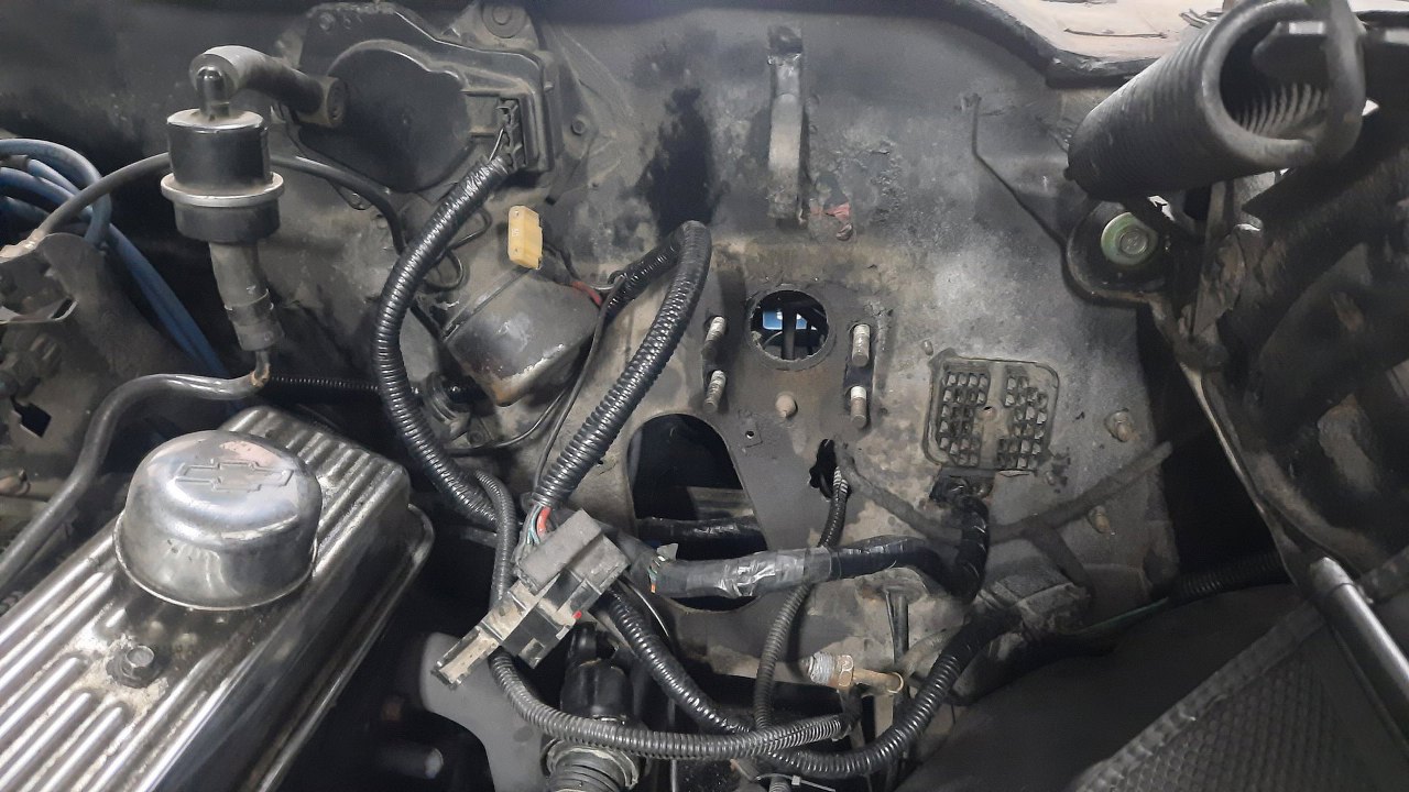 Udało mi się w końcu odkręcić serwo. Przy okazji Mateusz odkręcił kolumnę kierownicy - naprawi niedziałającą od zawsze stacyjkę (uruchamianie było dodatkową stacyjką i przyciskiem pod deską rozdzielczą) i odnowi samą kolumnę. Nie da się nie zauważyć, że nasi tu byli - pod tą kwadratową wtyczką instalacji elektrycznej jest kawałek blachy rozcięty i wygięty, pod serwem też jest dziwny otwór. Obydwiema drogami przechodzi wiązka do silnika, bez żadnej przelotki czy czegokolwiek chroniącego ją przed przetarciem. Na razie musimy udać, że tego nie widzimy - to wszystko będzie poprawione przy okazji porządków w silniku. Zniknie wtedy wtrysk paliwa i te wszystkie wiązki z nim związane, będzie wtedy można załatać te otwory.
