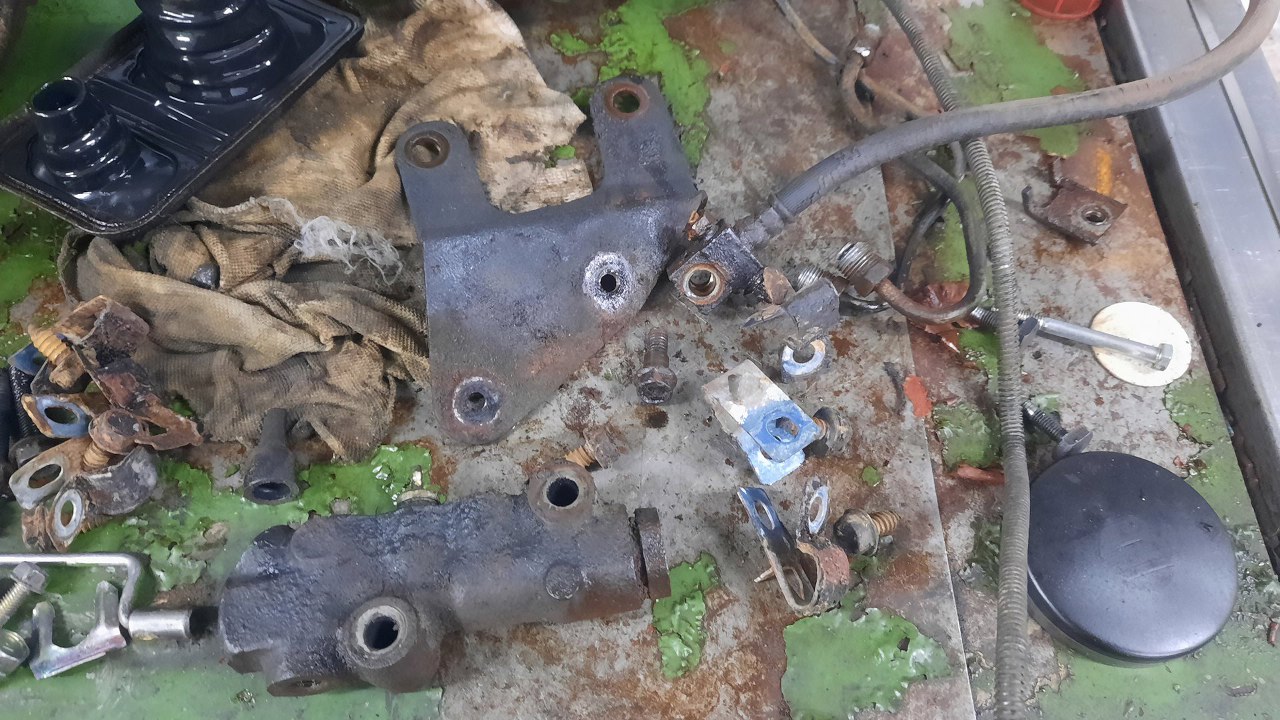 A tu zdjęte z samochodu części. W pompie hamulcowej breja ze starego płynu hamulcowego.
