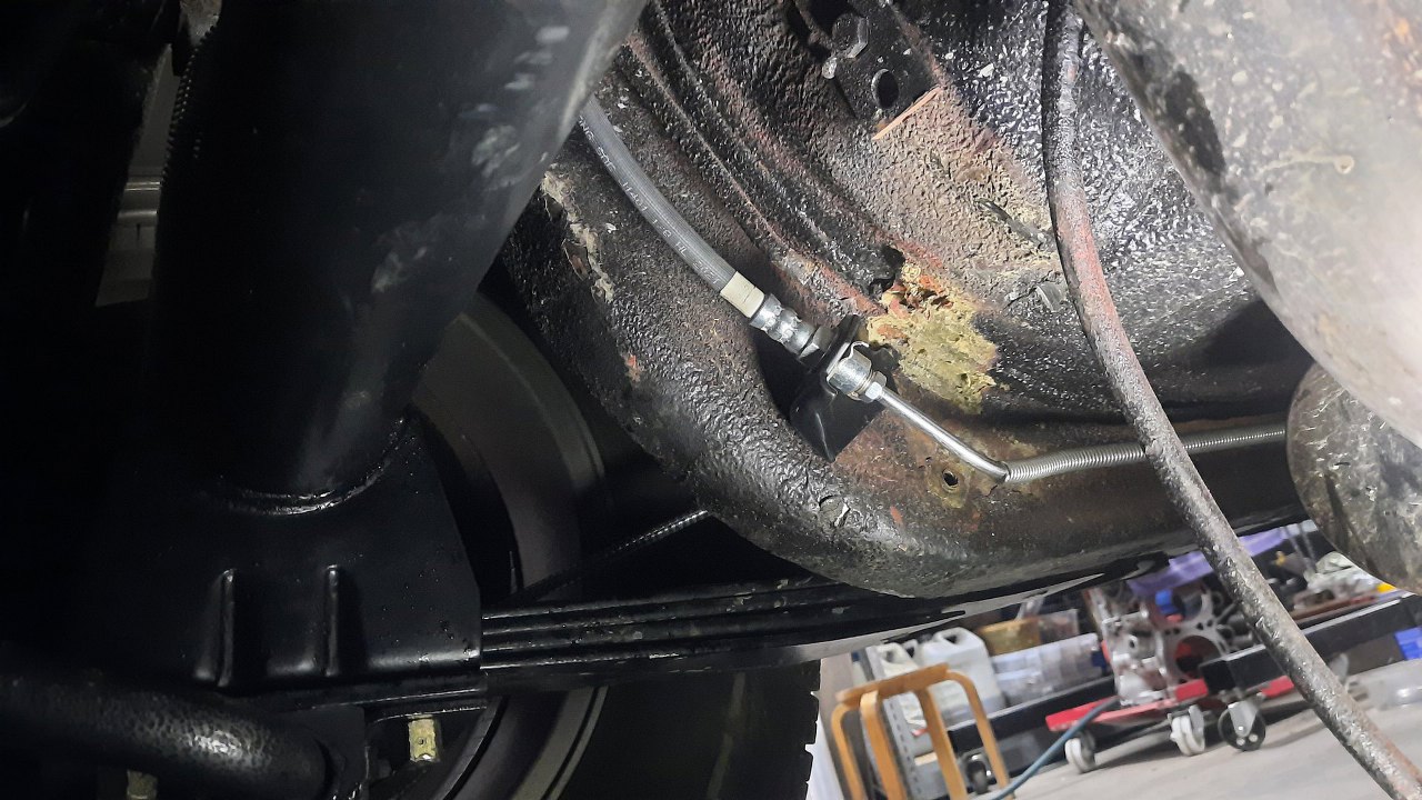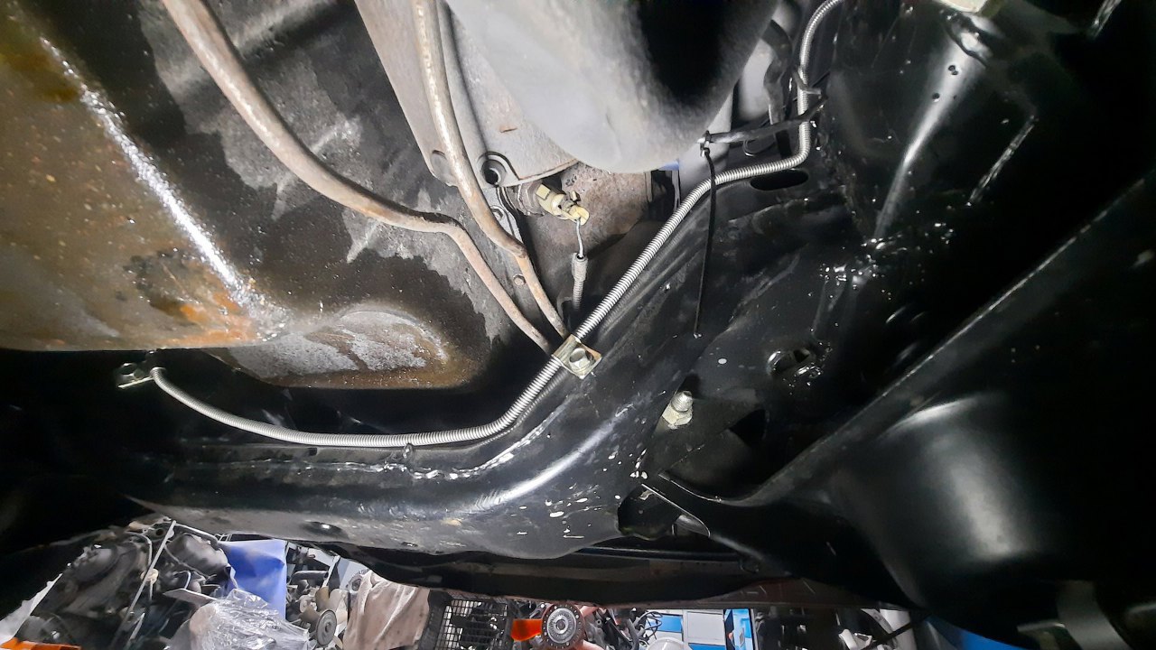 Jedyny problem był z rurką idącą na tył samochodu - oryginalnie wygięta była z miejsca widocznego na zdjęciu w stronę środka samochodu i tam łączyła się z przewodem elastycznym idącym do mostu. Nowa rurka jest krótsza i kończy się niedaleko za przednim mocowaniem resora. Na szczęście przewód elastyczny spokojnie tu sięga. Wykorzystałem oryginalne mocowanie łączenia tych rurek, lekko je tylko przerabiając, i wywierciłem nowe otwory do przykręcenia tego.