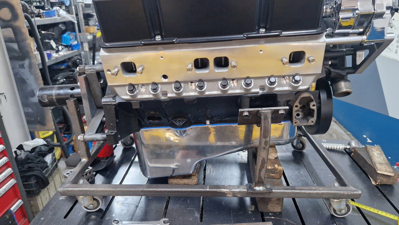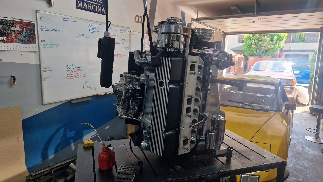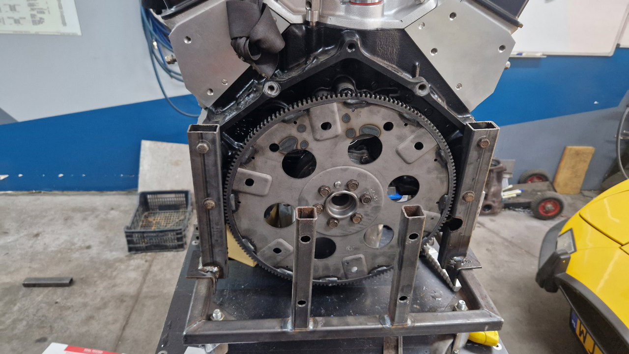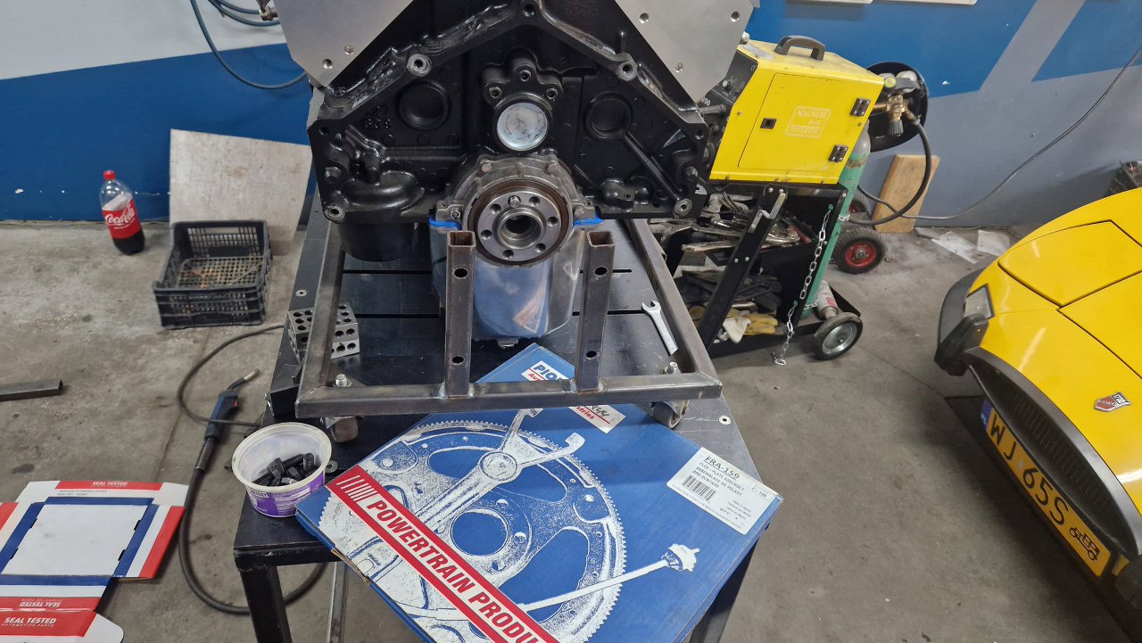 W zasadzie skończyły mi się części, które mogę przykręcać jak silnik wciąż wisi na stojaku montażowym, więc postanowiłem go przerzucić na inny stojak - ten, którego używam też do testowego uruchamiania silników poza samochodem. Trzeba tylko dorobić mocowania do small blocka :). Podniosłem silnik do góry...i oczywiście wpadł mi do głowy kolejny głupi pomysł, jak zobaczyłem silnik i Matrę tak obok siebie. Nieważne, zrobimy takiego swapa kiedy indziej :).
