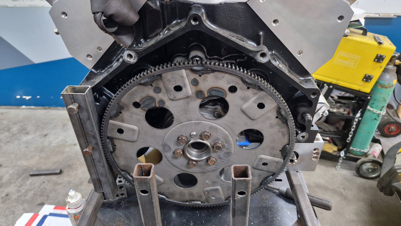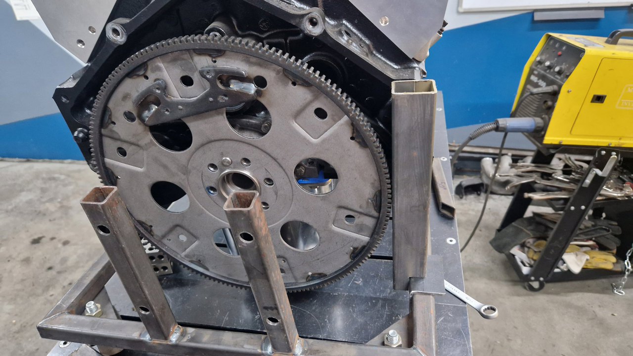 Silnik postawiłem na stole nad docelowym stojakiem i zacząłem wymyślać mocowania. Przód to po prostu kawałek stali przykręcony do trzech otworów w bloku, gdzie normalnie przychodzą poduszki. Na ramie oparty bez przykręcania - jest tak ciężki, że nigdzie nie ucieknie :).