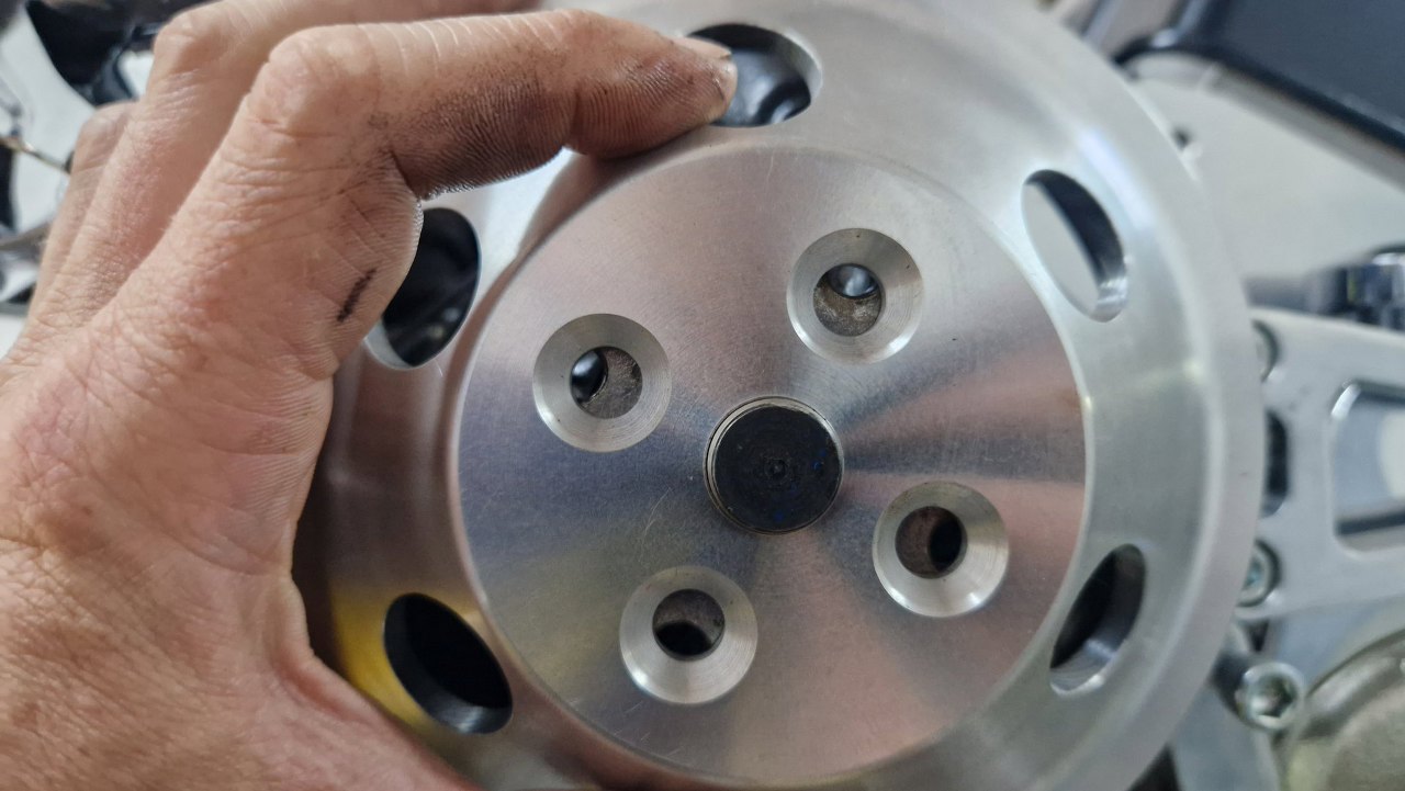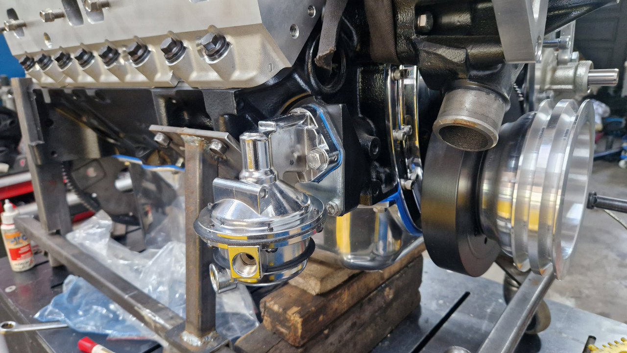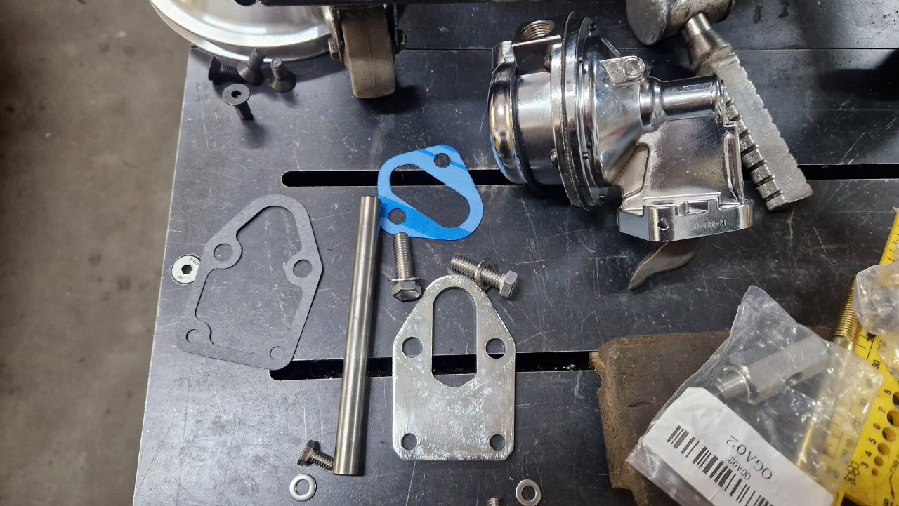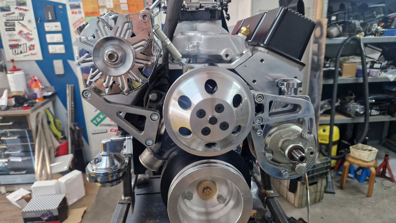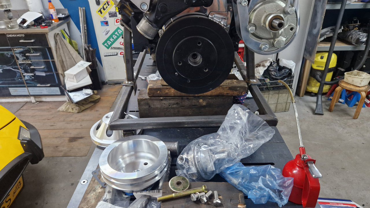 Mogę więc dalej przykręcać różne rzeczy. Przymierzam mocowania pompy wspomagania i alternatora, ale różnie pasują i mają niewłaściwe śruby, więc po prostu będą przewijać się na zdjęciach. Suby ostatecznie dokupię poprawne. Póki co mam części do przykręcenia koła pasowego wału i pompę paliwa.