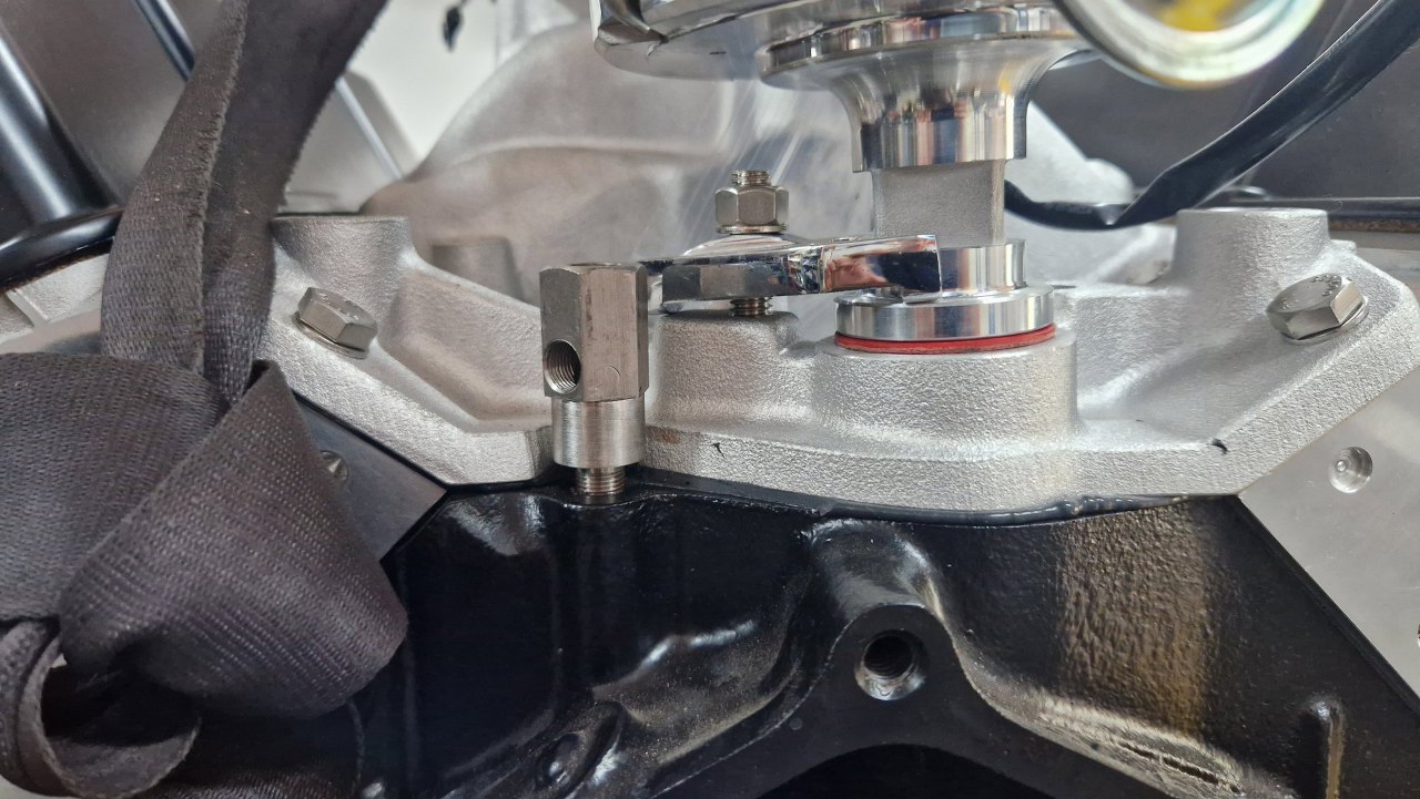 Z tyłu silnika, przy kolektorze dolotowym, jest miejce na czujnik ciśnienia oleju. Nie mieści się on przy kolektorze, więc potrzebny jest króciec, który go podniesie powyżej kolektora. Ten króciec niestety też się nie mieścił, więc podtoczyłem jego dolną część.