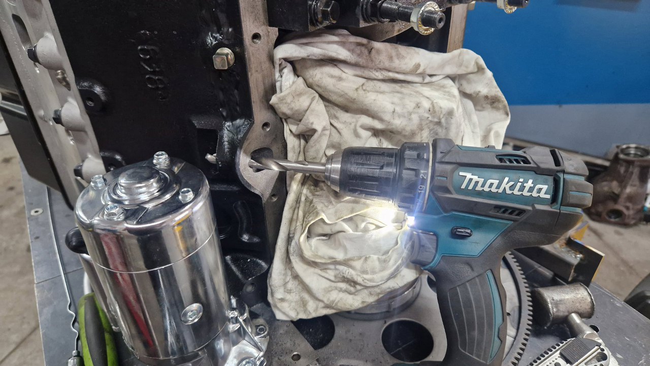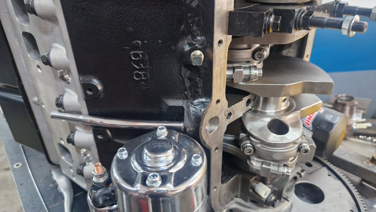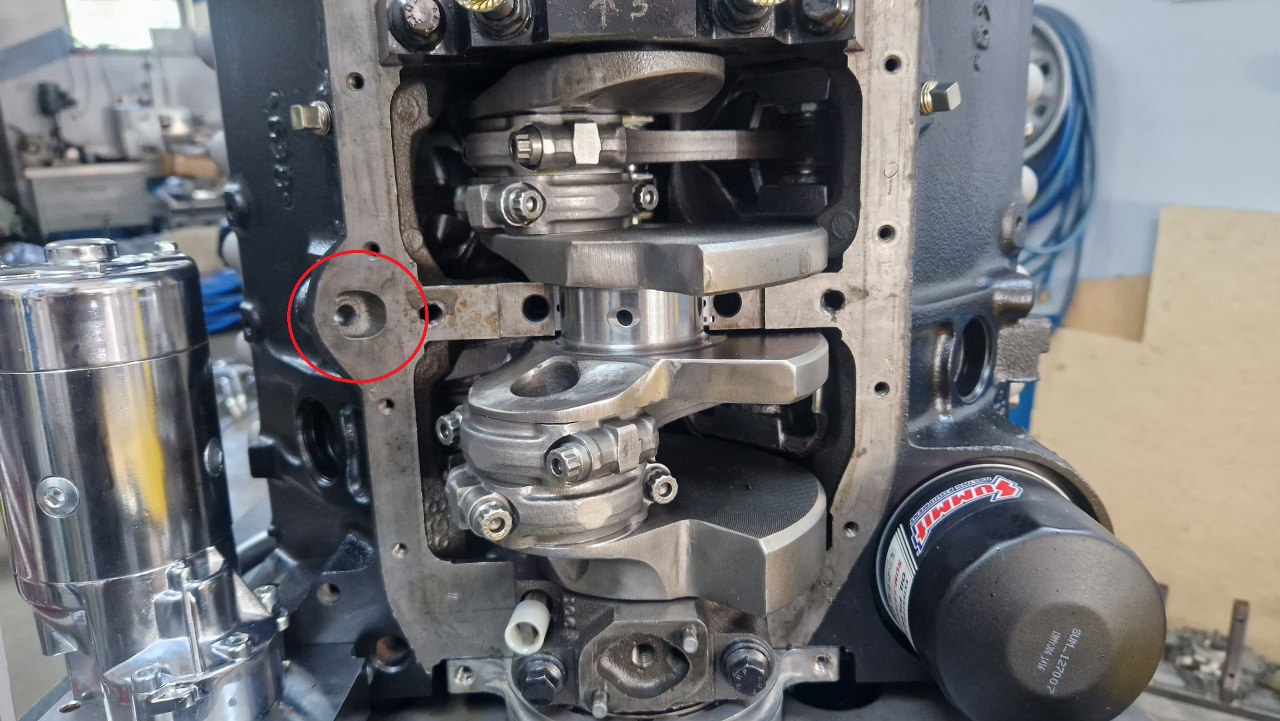 Potem chciałem założyć rurkę bagnetu oleju... i to eskalowało dość szybko. Blok silnika pochodzi z łodzi, a tam bagnet był zdaje się w misce oleju. Oryginalne miejsce na bagnet zaznaczyłem na zdjęciu poniżej - tyle, że tu jest zaślepione kołkiem. Żeby się do niego dostać, musiałem zdjąć miskę, co nie jest łatwe przy tak złożonym silniku. Ostatecznie postawiłem go w pionie i tak zdjąłem miskę. Zdjąłem też środkową podporę wału, zaraz zobaczysz dlaczego.