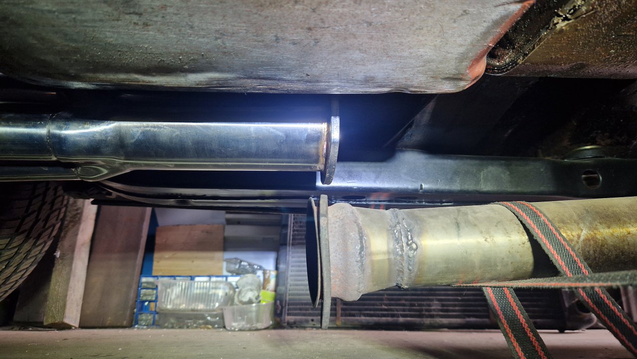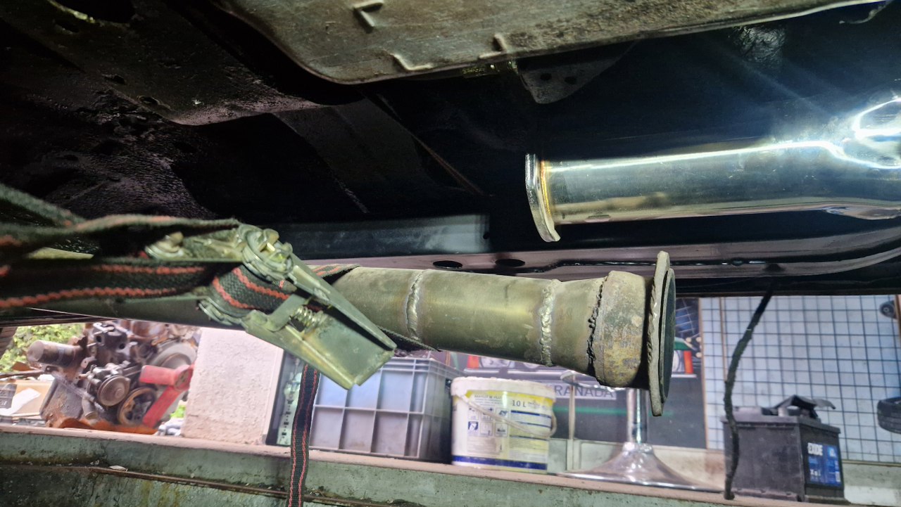 Następną rzeczą do ogarnięcia był wydech. Flansza na kolektorze dotykała do podłogi, więc musiałem nieco tą podłogę podnieść. Poza tym nowe kolektory są ciut dłuższe niż stare, więc muszę skrócić resztę rur.