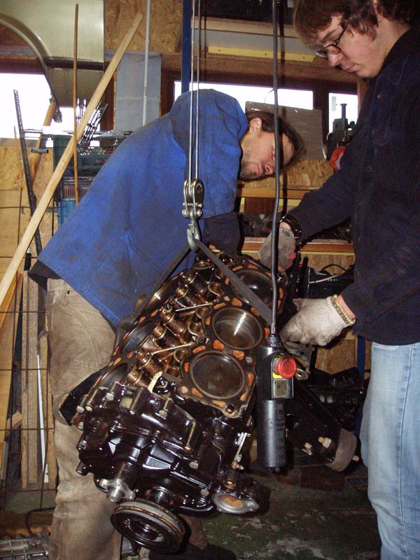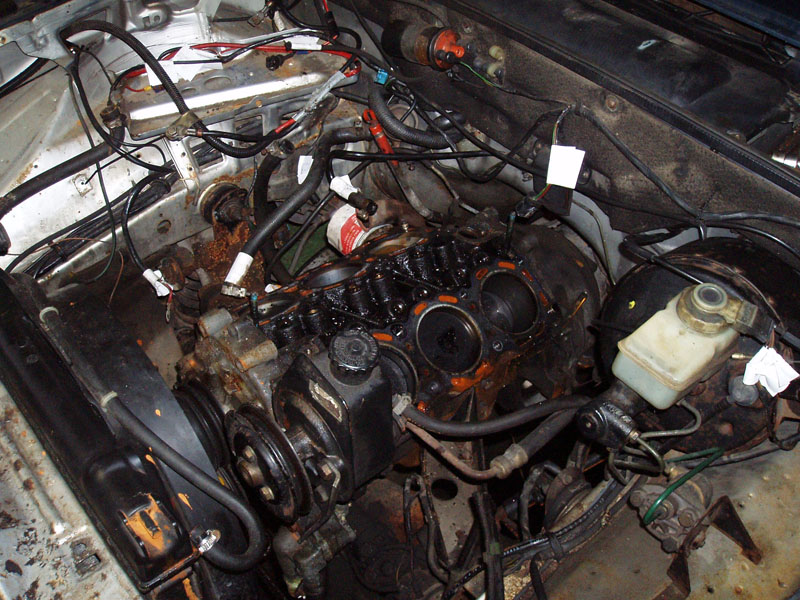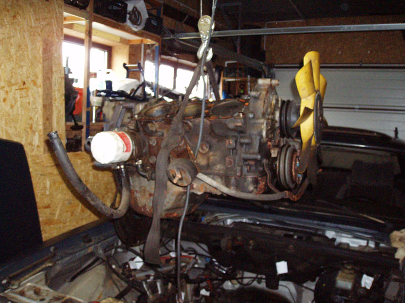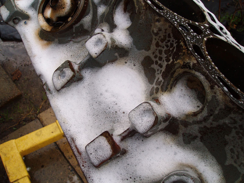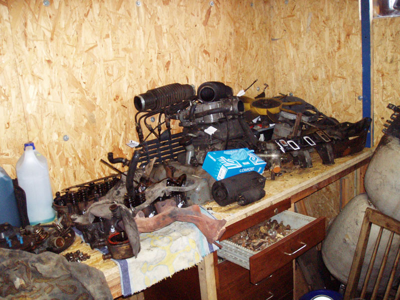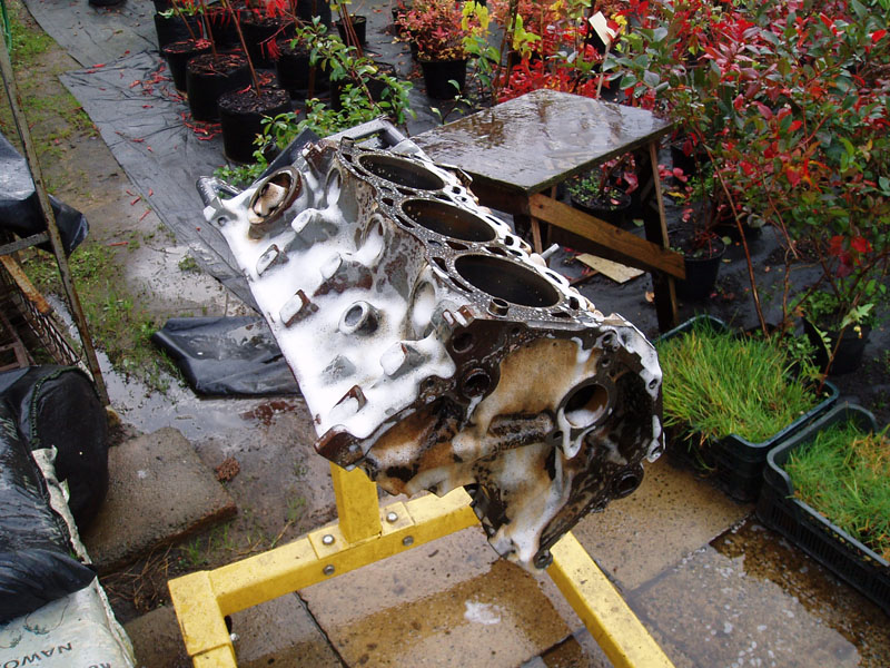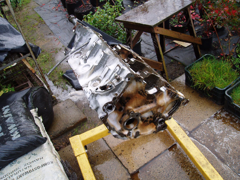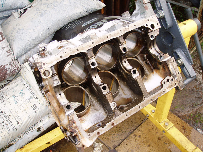 Podsumowanie trzech dni dni pracy: Jest dobrze. Z silnikiem. Za to okazało się, że wydech był, bo był, ale go raczej nie było... Pompa hamulcowa puszczała płyn do serwa... W komorze silnika wszędzie nalot rdzy. I do tego piaskarnia i lakiernia proszkowa zrobi graty (wszystkie pierdułki z komory silnika + miska olejowa, pokrywy zaworów i łapy silnika) dopiero za miesiąc. Dobrze, że części silnikowe mam zapasowe, już wypiaskowane i wymalowane, przynajmniej silnik złożę. A - z wału korbowego nie chciało zejść koło pasowe żadnym ściągaczem. Musiałem ściągnąć wał razem z pokrywą rozrządu. Ciężkie :) I oczywiście urwałem dwie śrubki od pompy wody w pokrywie rozrządu :(