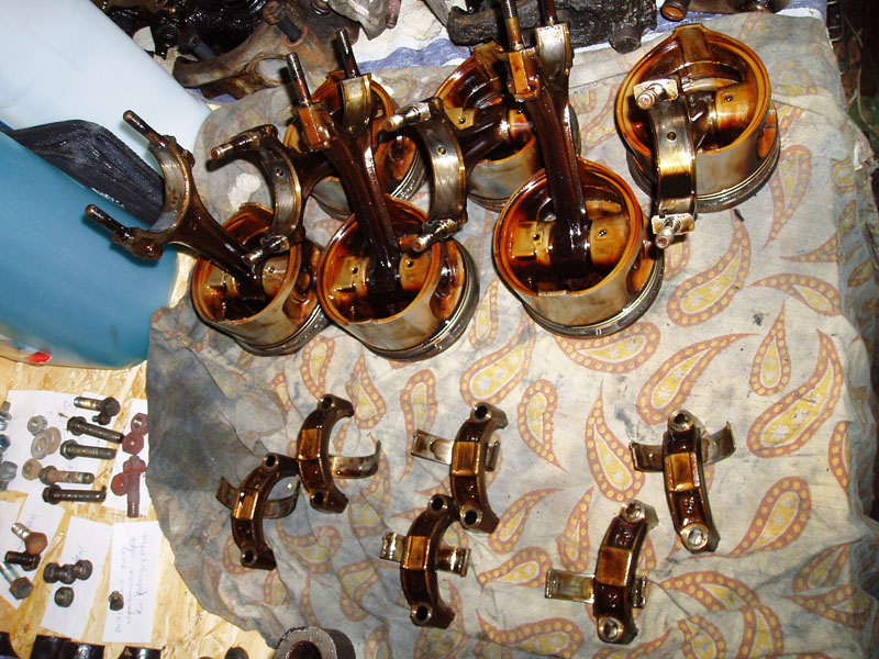 Od dołu lepiej, nadal szlam, ale też wszystko nominalne. Panewki główne idealne, korbowodowe porządnie przytarte - efekt tego przegrzania. Ciekawe, że silnik nie klepał tak mocno...