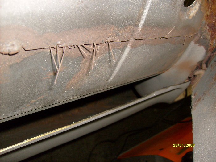 A tak wygląda zakończenie (przed tylnym kołem) lewego progu. Po otwarciu profilu obraz nędzy i rozpaczy.