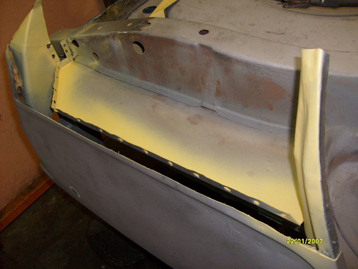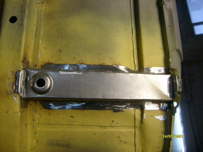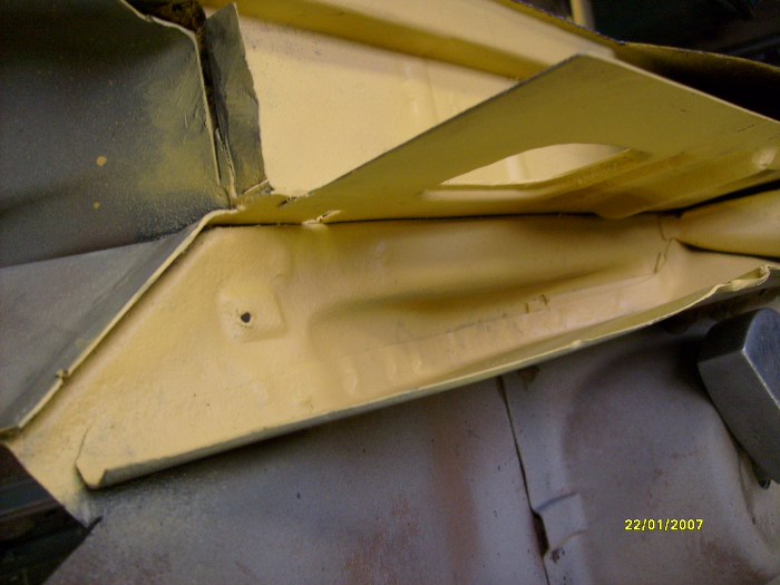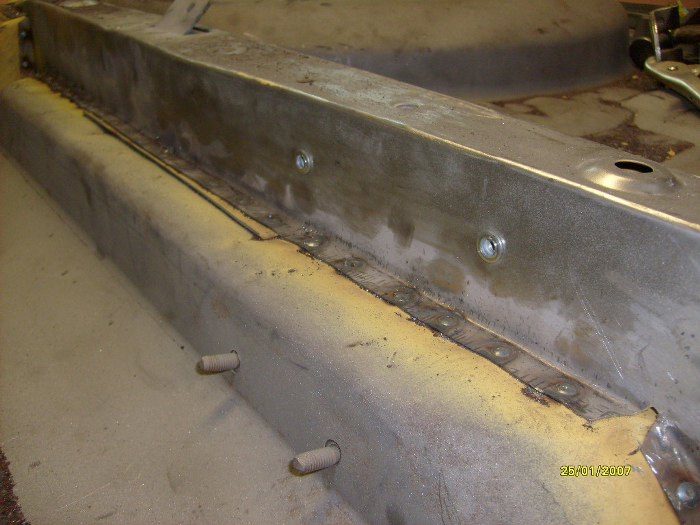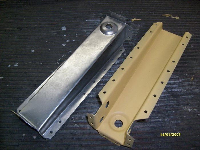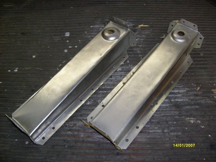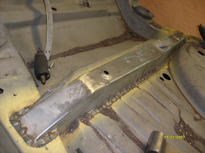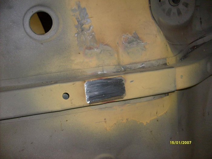 Dorobione elementy poprzeczek z przodu. Fabrycznie miały one otwory na podnośnik, ale zrezygnowaęm z tego za namową Zapka. Dzięki temu nie będzie miejsca na powstawanie rdzy, chociaż stracę możliwość podnoszenia auta fabrycznym podnośnikiem. Trudno, kupię jakiś nożycowy od współczesnego auta, np. w swojej hondzie mam taki, co wydaje mi się, że będzie odpowiedni.