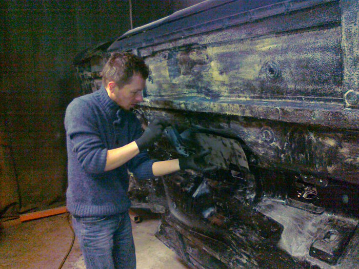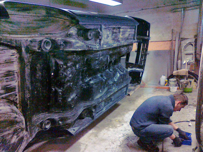 Następnie auto wróciło do Zapka na zabezpieczenie podwozia i profili woskami. Operacja dość ryzykowna, bo żeby to wszystko wsiąkło w zakamarki, to wykonywana na obrotnicy. Zdjęcia kiepskie, bo wykonywane szlifierką kątową.