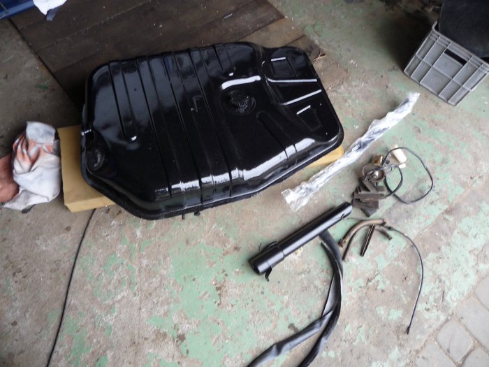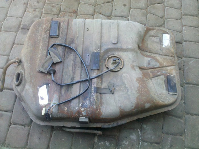 Zbiornik wypiaskowany, pomalowany podkładem cynkowym i dwa razy chlorokauczukiem. Pasy mocujące i rura wlewowa wypiaskowana i pomalowane proszkowo. Do tego nowe rurki i stara dętka rowerowa pomiędzy pasy mocujące a zbiornik, żeby się nie ocierały.