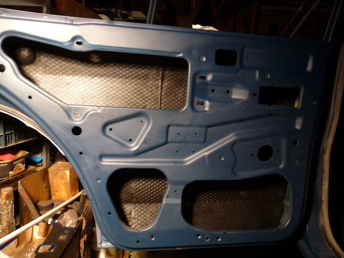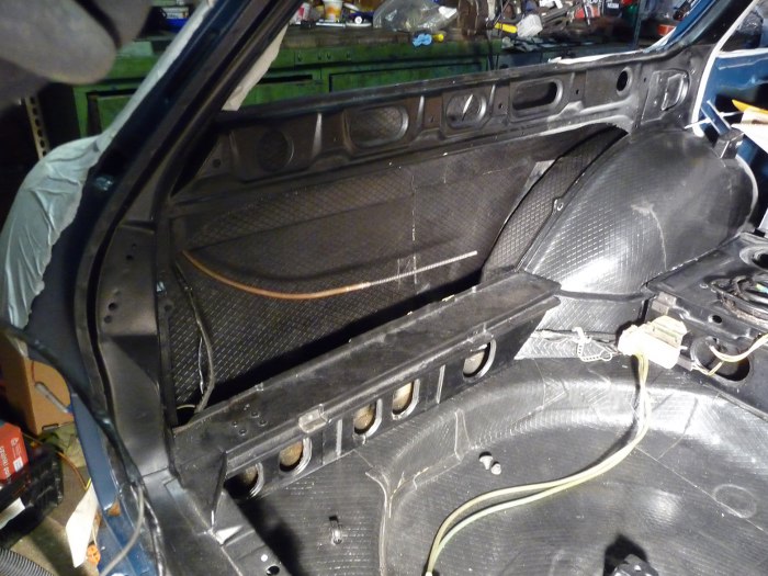 Wykleiłem też wygłuszeniem lewą stronę i wnękę na koło zapasowe. Pręt widoczny to napęd szyberdachu, przełożony z sedana. W kombi nigdy nie było elektrycznego szybra. Tu będzie :)