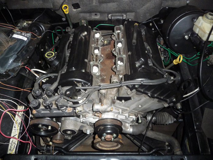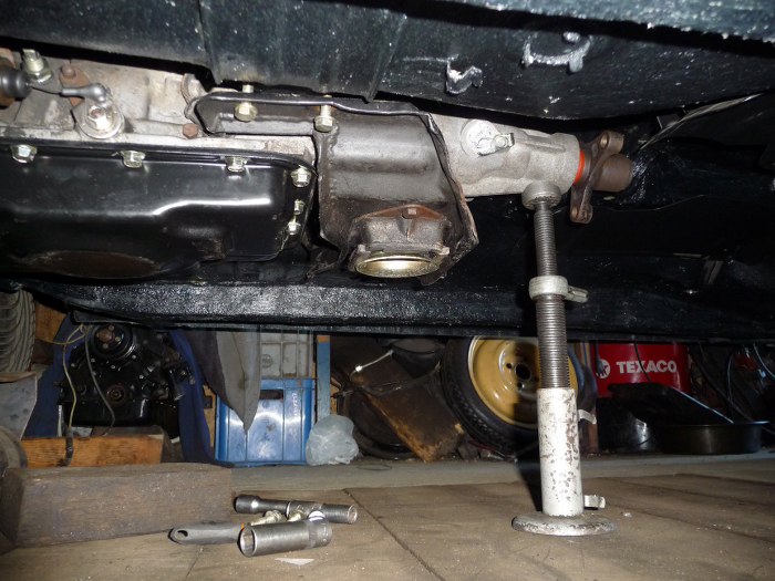 Potem dokończyłem spinanie silnika ze skrzynią - przykręciłem wszystkie śruby je łączące, łącznie z widocznym na zdjęciu kołem zamachowym/konwerterem, położyłem kable rozrusznika i masowy, przykręciłem rurkę bagnetu skrzyni i rurkę podciśnienia skrzyni. Założyłem rozrusznik od coswortha, a nie stary od 2.8, bo raz, że lepiej wyglądał, a mi się nie chciało już nic odnawiać, a dwa, że jest już nowszego typu, z przekładnią planetarną.