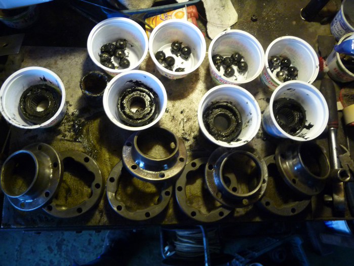 Ponieważ i tak miałem zdemontowane przeguby, to stwierdziłem, że je sprawdzę dokładniej, bo nie miały luzów jak jeździły na samochodzie. Na początku rozłożyłem je wszystkie. Potem powycierałem z grubsza smar, żeby obejrzeć ew. zużycia. Dość mocno się zdziwiłem, jak zobaczyłem, że są to jeszcze fabrycznie zamontowane części (znaczki Forda na każdym) w idealnym stanie - żadnych przetarć, śladów zużycia itp. Dlatego zostaną dokładnie wyczyszczone i poskładane na nowym smarze, żeby posłużyły kolejne dziesiątki tysięcy kilometrów :)