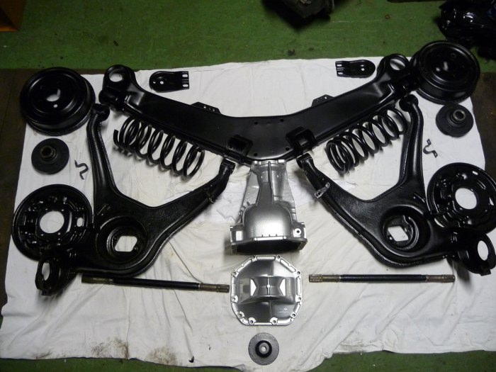 Potem podnieśliśmy zawieszenie i podłożyliśmy pod wahacze felgi, żeby leżały wyżej - dopiero wtedy dało się w prosty sposób unieść belkę zawieszenia do karoserii i ją tam przykręcić.