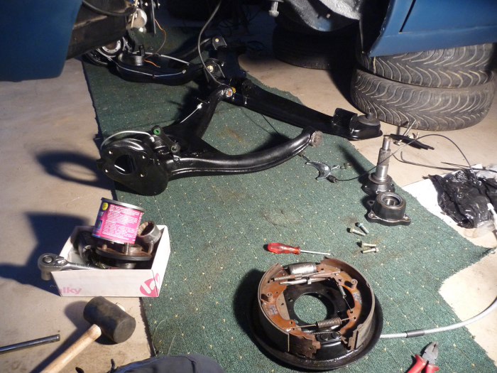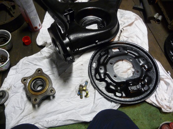Potem jednak to sprzątnąłem, bo za dużo miejsca zajmowało i zacząłem składać. Wcisnęliśmy z Dredem na prasie gumy do belki zawieszenia i do wahaczy. Teraz zabieram się za składanie lewego wahacza, widać na zdjęciu przygotowaną tarczę kotwiczną, obudowę z łożyskiem i śrubki do tego.