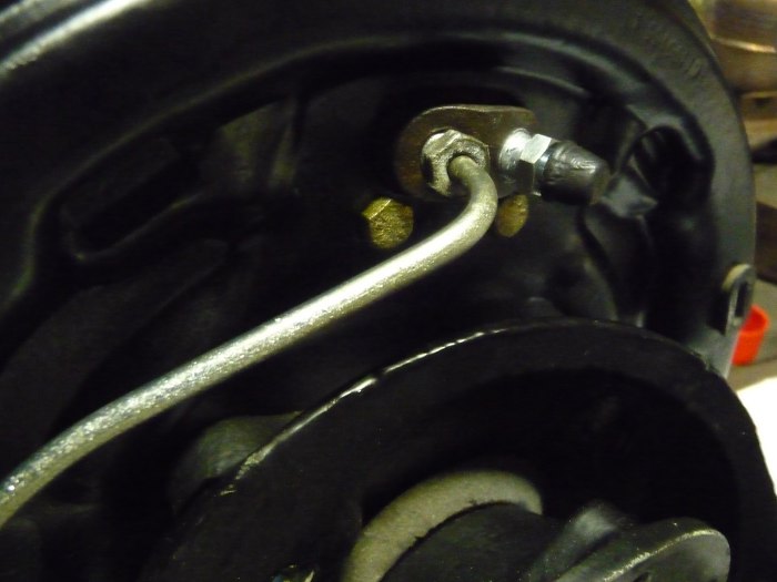 Cylinderek przykręcony. Widać nowy odpowietrznik i rurkę hamulcową, która jest stara - została oczyszczona z rdzy i ocynkowana.