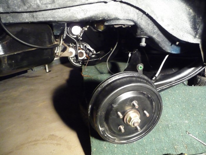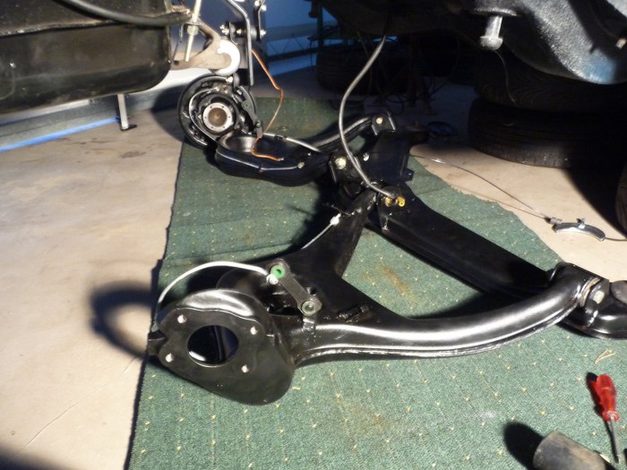 Potem założyłem bęben i łącznik stabilizatora. Łącznik ma dorobione poliuretany, bo oryginalne gumy się rozsypały w rękach. Mam gotowy już jeden wahacz.