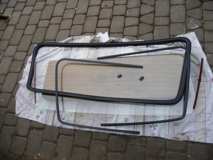 Przygotowałęm po kolei wszystkie szyby - znalazłem komplet przezroczystych, nie barwionych na brązowo, umyłem. Listwy ozdobne zostały porządnie zmatowione i pomalowane na czarno (były chromowane). Uszczelki zostały wymyte z całego kurzu, który nazbierały od nowości. Tu przykładowo szyba tylnej klapy z wszystkimi elementami składowymi potrzebnymi do montażu. W podobny sposób w aucie znalazły się wszystkie szyby drzwiowe.